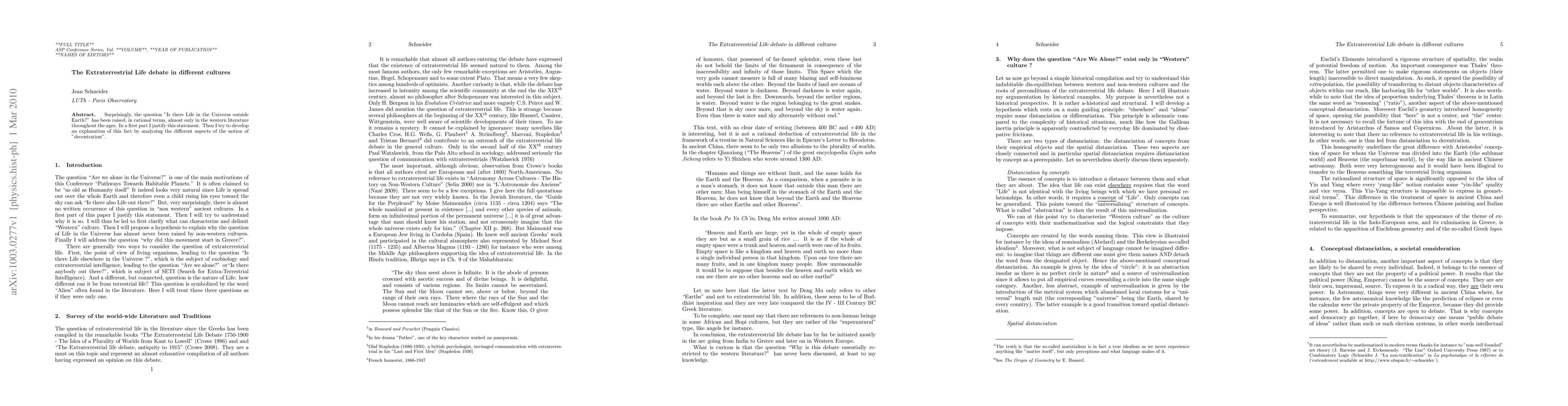 Surprisingly, the question "Is there Life in the Universe outside Earth?" has been raised, in rational terms, almost only in the western literature throughout the ages. In a first part I justify this statement. Then I try to develop an explanation of this fact by analyzing the different aspects of the notion of decentration.