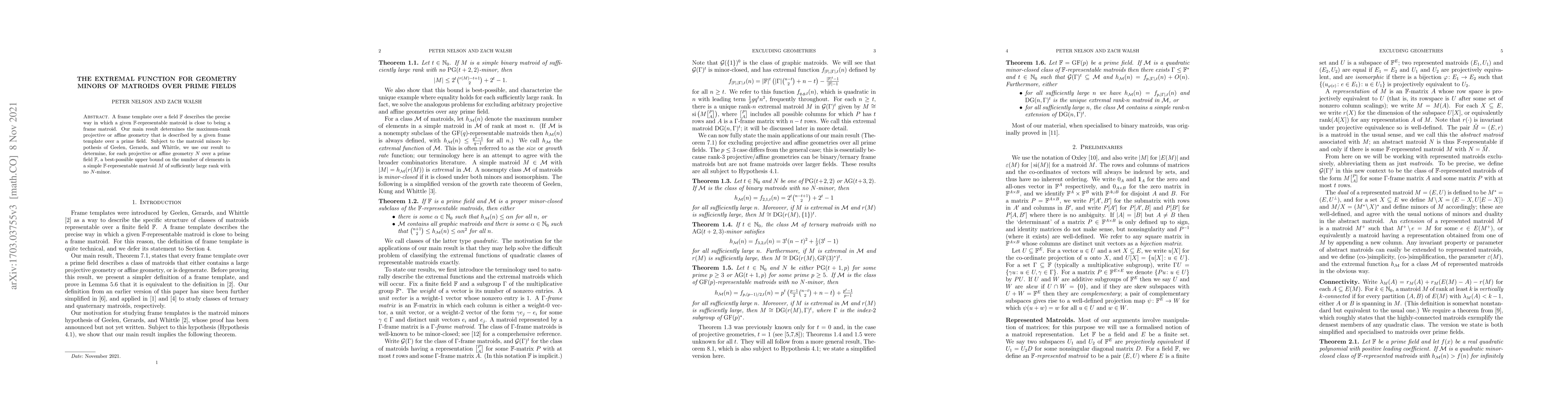 A frame template over a field $\mathbb F$ describes the precise way in which a given $\mathbb F$-representable matroid is close to being a frame matroid. Our main result determines the maximum-rank projective or affine geometry that is described by a given frame template over a prime field. Subject to the matroid minors hypothesis of Geelen, Gerards, and Whittle, we use our result to determine, for each projective or affine geometry $N$ over a prime field $\mathbb F$, a best-possible upper bound on the number of elements in a simple $\mathbb F$-representable matroid $M$ of sufficiently large rank with no $N$-minor.