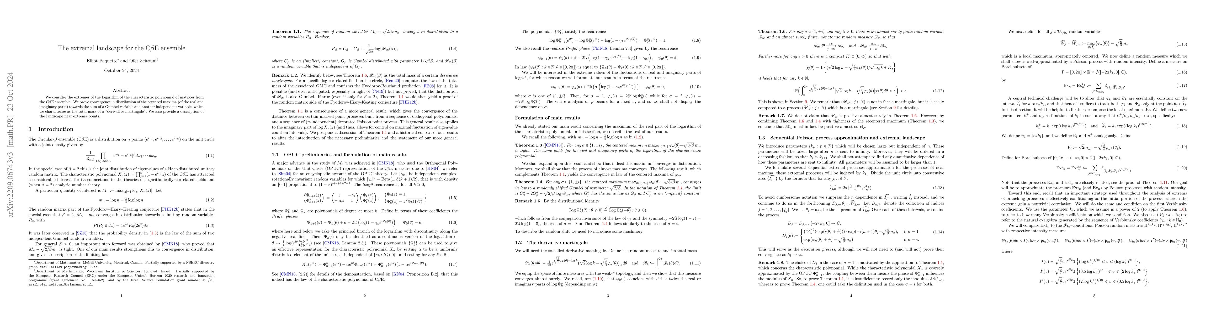 This paper investigates the extreme values of the logarithm of the characteristic polynomial for matrices from the C$\beta$E ensemble, proving their convergence in distribution to a combination of a Gumbel variable and an independent variable representing the total mass of a "derivative martingale." It also describes the landscape around the extrema points.