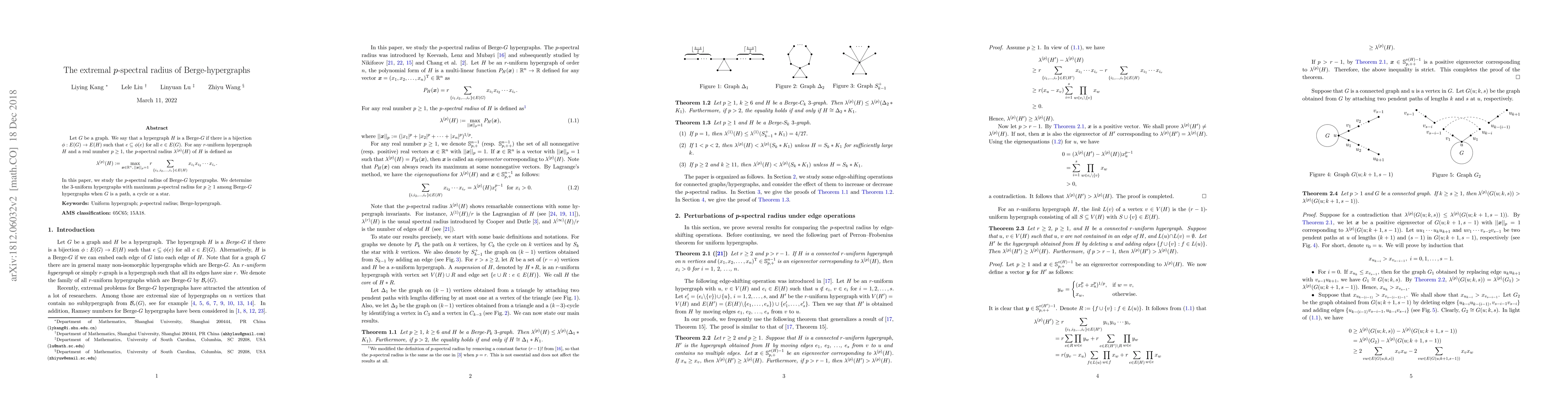 Let $G$ be a graph. We say that a hypergraph $H$ is a Berge-$G$ if there is a bijection $\phi: E(G)\to E(H)$ such that $e\subseteq \phi(e)$ for all $e\in E(G)$. For any $r$-uniform hypergraph $H$ and a real number $p\geq 1$, the $p$-spectral radius $\lambda^{(p)}(H)$ of $H$ is defined as \[ \lambda^{(p)}(H):=\max_{{\bf x}\in\mathbb{R}^n,\,\|{\bf x}\|_p=1} r\sum_{\{i_1,i_2,\ldots,i_r\}\in E(H)} x_{i_1}x_{i_2}\cdots x_{i_r}. \] In this paper, we study the $p$-spectral radius of Berge-$G$ hypergraphs. We determine the $3$-uniform hypergraphs with maximum $p$-spectral radius for $p\geq 1$ among Berge-$G$ hypergraphs when $G$ is a path, a cycle or a star.