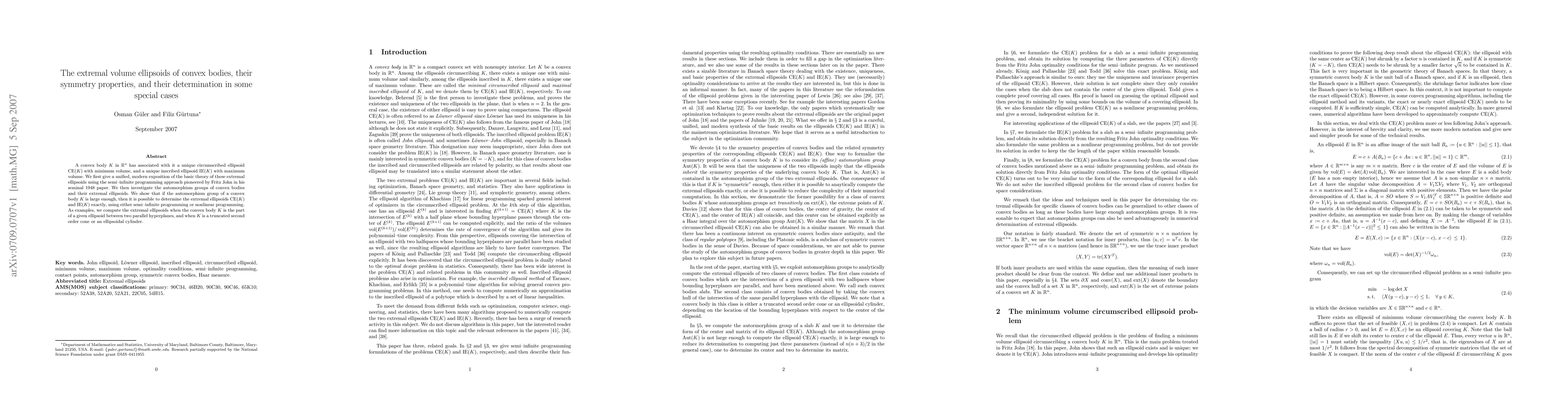 This paper explores the extremal volume ellipsoids associated with convex bodies, presenting a modern exposition on their theory and determination using semi-infinite programming. It also investigates the symmetry properties and computational methods for determining these extremal ellipsoids when the convex body has a sufficiently large automorphism group.