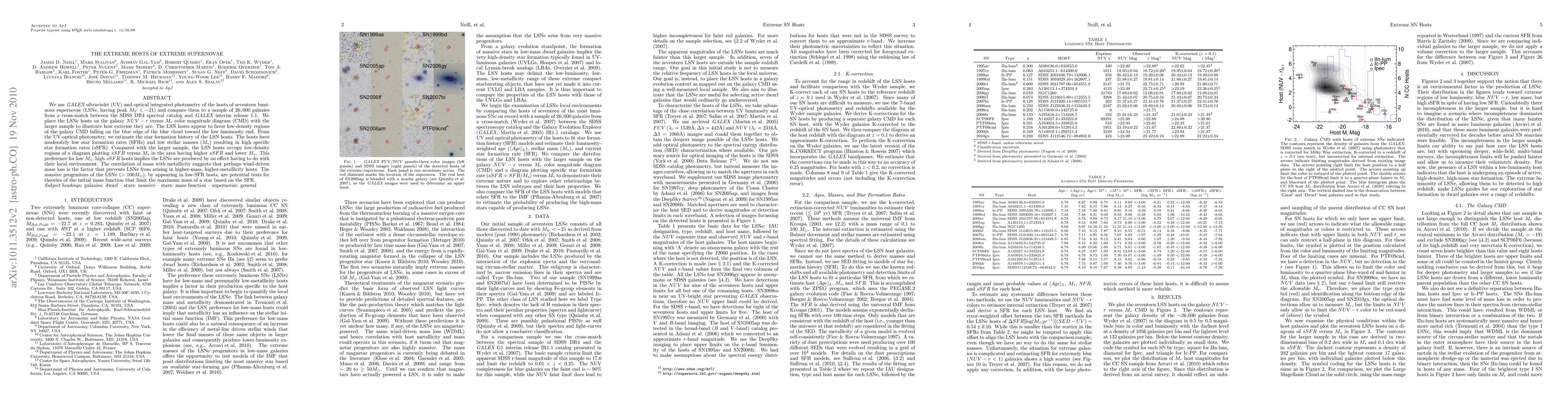 We use GALEX ultraviolet (UV) and optical integrated photometry of the hosts of seventeen luminous supernovae (LSNe, having peak M_V < -21) and compare them to a sample of 26,000 galaxies from a cross-match between the SDSS DR4 spectral catalog and GALEX interim release 1.1. We place the LSNe hosts on the galaxy NUV-r versus M_r color magnitude diagram (CMD) with the larger sample to illustrate how extreme they are. The LSN hosts appear to favor low-density regions of the galaxy CMD falling on the blue edge of the blue cloud toward the low luminosity end. From the UV-optical photometry, we estimate the star formation history of the LSN hosts. The hosts have moderately low star formation rates (SFRs) and low stellar masses (M_*) resulting in high specific star formation rates (sSFR). Compared with the larger sample, the LSN hosts occupy low-density regions of a diagram plotting sSFR versus M_* in the area having higher sSFR and lower M_*. This preference for low M_*, high sSFR hosts implies the LSNe are produced by an effect having to do with their local environment. The correlation of mass with metallicity suggests that perhaps wind-driven mass loss is the factor that prevents LSNe from arising in higher-mass, higher-metallicity hosts. The massive progenitors of the LSNe (>100 M_sun), by appearing in low-SFR hosts, are potential tests for theories of the initial mass function that limit the maximum mass of a star based on the SFR.