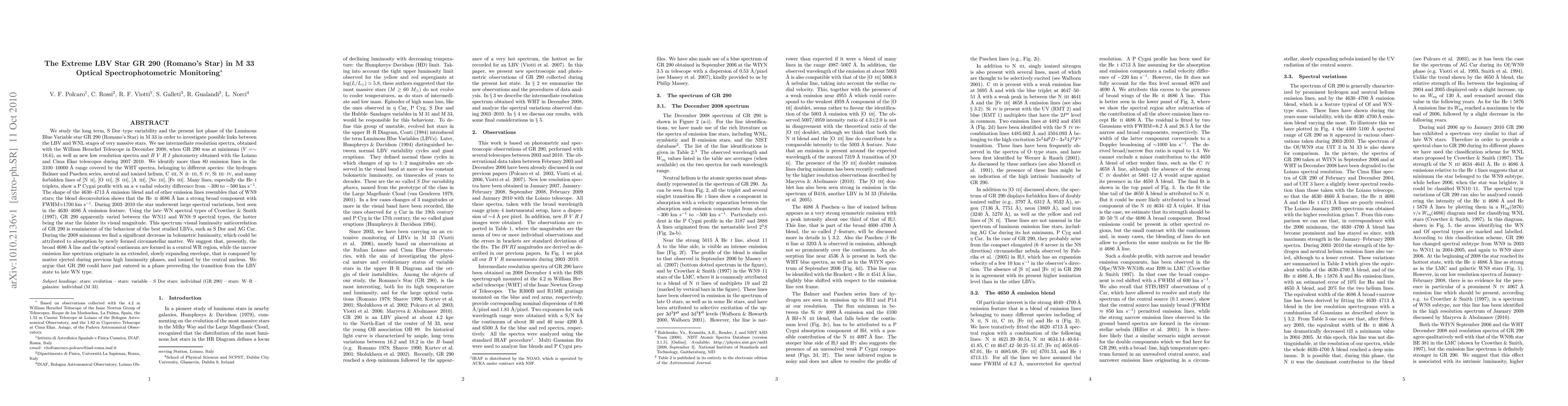 We study the long term, S Dor-type variability and the present hot phase of the LBV star GR290 (Romano's Star) in M33 in order to investigate possible links between the LBV and WNL stages of very massive stars. We use intermediate resolution spectra, obtained with WHT in December 2008, when GR290 was at minimum (V = 18.6), as well as new low resolution spectra and B V R I photometry obtained with the Loiano and Cima Ekar telescopes during 2007-2010. We identify more than 80 emission lines in the 3100-10000 A range, belonging to different species and to forbidden transitions. Many lines, especially the HeI triplets, show a P Cygni profile with an a-e radial velocity difference from -300 to -500 km/s. The shape of the 4630-4713 A emission blend and of other emission lines resembles that of WN9 stars; the blend deconvolution shows that the HeII 4686 A has a strong broad component with FWHM \simeq 1700 km/s. During 2003-2010 the star underwent large spectral variations, best seen in the 4630-4686 A emission feature. Using the late-WN spectral types of Crowther & Smith (1997), GR290 apparently varied between the WN11 and WN8-9 spectral types, the hotter being the star the fainter its visual magnitude. This spectrum-visual luminosity anticorrelation of GR290 is reminiscent of the behaviour of the best studied LBVs. During the 2008 minimum we find a significant decrease in bolometric luminosity, which could be attributed to absorption by newly formed circumstellar matter. We suggest that, presently, the broad 4686 A line and the optical continuum are formed in a central WR region, while the narrow emission line spectrum originate in an extended, slowly expanding envelope, that is composed by matter ejected during previous high luminosity phases, and ionized by the central nucleus. GR290 could have just entered in a phase preceeding the transition from the LBV state to late WN type.