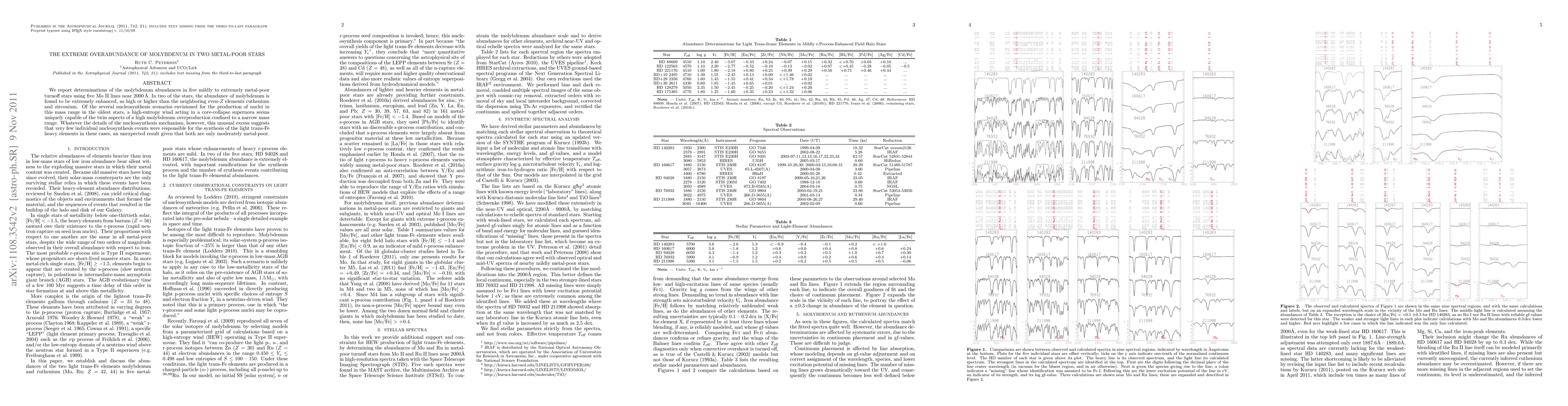 We report determinations of the molybdenum abundances in five mildly to extremely metal-poor turnoff stars using five Mo II lines near 2000A. In two of the stars, the abundance of molybdenum is found to be extremely enhanced, as high or higher than the neighboring even-Z elements ruthenium and zirconium. Of the several nucleosynthesis scenarios envisioned for the production of nuclei in this mass range in the oldest stars, a high-entropy wind acting in a core-collapse supernova seems uniquely capable of the twin aspects of a high molybdenum overproduction confined to a narrow mass range. Whatever the details of the nucleosynthesis mechanism, however, this unusual excess suggests that very few individual nucleosynthesis events were responsible for the synthesis of the light trans-Fe heavy elements in these cases, an unexpected result given that both are only moderately metal-poor.