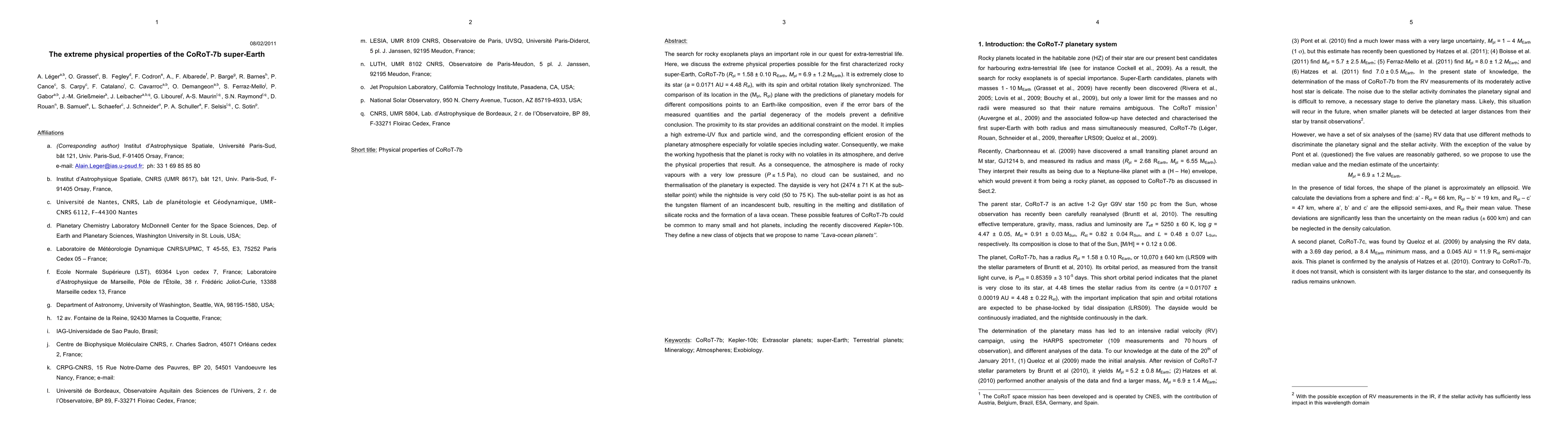 The search for rocky exoplanets plays an important role in our quest for extra-terrestrial life. Here, we discuss the extreme physical properties possible for the first characterized rocky super-Earth, CoRoT-7b (R_pl = 1.58 \pm 0.10 R_Earth, Mpl = 6.9 \pm 1.2 M_Earth). It is extremely close to its star (a = 0.0171 AU = 4.48 R_st), with its spin and orbital rotation likely synchronized. The comparison of its location in the (Mpl, Rpl) plane with the predictions of planetary models for different compositions points to an Earth-like composition, even if the error bars of the measured quantities and the partial degeneracy of the models prevent a definitive conclusion. The proximity to its star provides an additional constraint on the model. It implies a high extreme-UV flux and particle wind, and the corresponding efficient erosion of the planetary atmosphere especially for volatile species including water. Consequently, we make the working hypothesis that the planet is rocky with no volatiles in its atmosphere, and derive the physical properties that result. As a consequence, the atmosphere is made of rocky vapours with a very low pressure (P \leq 1.5 Pa), no cloud can be sustained, and no thermalisation of the planetary is expected. The dayside is very hot (2474 \leq 71 K at the sub-stellar point) while the nightside is very cold (50 to 75 K). The sub-stellar point is as hot as the tungsten filament of an incandescent bulb, resulting in the melting and distillation of silicate rocks and the formation of a lava ocean. These possible features of CoRoT-7b could be common to many small and hot planets, including the recently discovered Kepler-10b. They define a new class of objects that we propose to name "Lava-ocean planets".