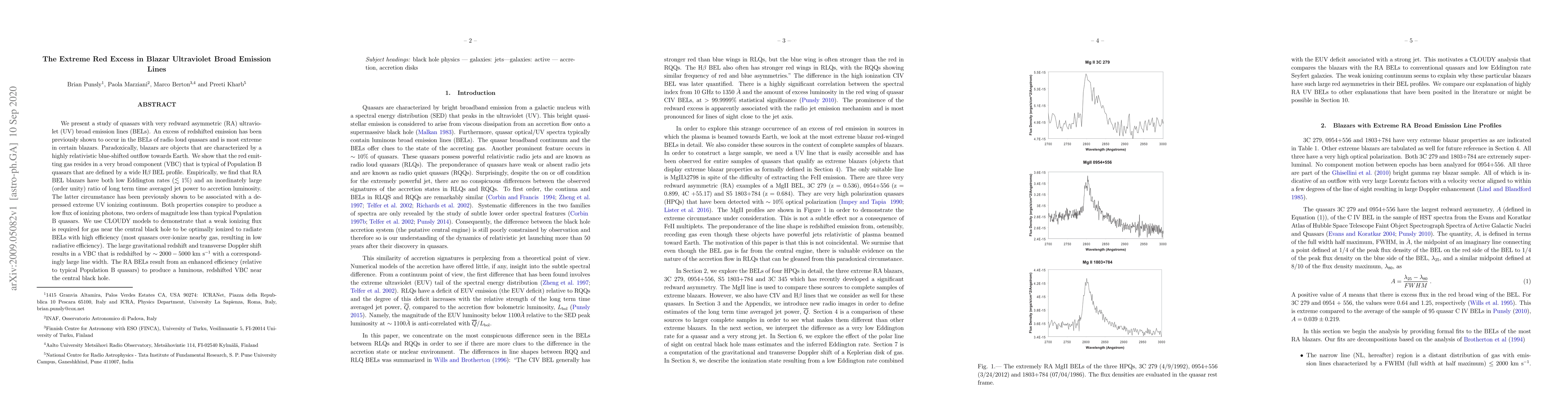 We present a study of quasars with very redward asymmetric (RA) ultraviolet (UV) broad emission lines (BELs). An excess of redshifted emission has been previously shown to occur in the BELs of radio loud quasars and is most extreme in certain blazars. Paradoxically, blazars are objects that are characterized by a highly relativistic blue-shifted outflow towards Earth. We show that the red emitting gas resides in a very broad component (VBC) that is typical of Population B quasars that are defined by a wide H$\beta$ BEL profile. Empirically, we find that RA BEL blazars have both low Eddington rates ($\lesssim1\%$) and an inordinately large (order unity) ratio of long term time averaged jet power to accretion luminosity. The latter circumstance has been previously shown to be associated with a depressed extreme UV ionizing continuum. Both properties conspire to produce a low flux of ionizing photons, two orders of magnitude less than typical Population B quasars. We use CLOUDY models to demonstrate that a weak ionizing flux is required for gas near the central black hole to be optimally ionized to radiate BELs with high efficiency (most quasars over-ionize nearby gas, resulting in low radiative efficiency). The large gravitational redshift and transverse Doppler shift results in a VBC that is redshifted by $\sim 2000 -5000$~km~s$^{-1}$ with a correspondingly large line width. The RA BELs result from an enhanced efficiency (relative to typical Population B quasars) to produce a luminous, redshifted VBC near the central black hole.