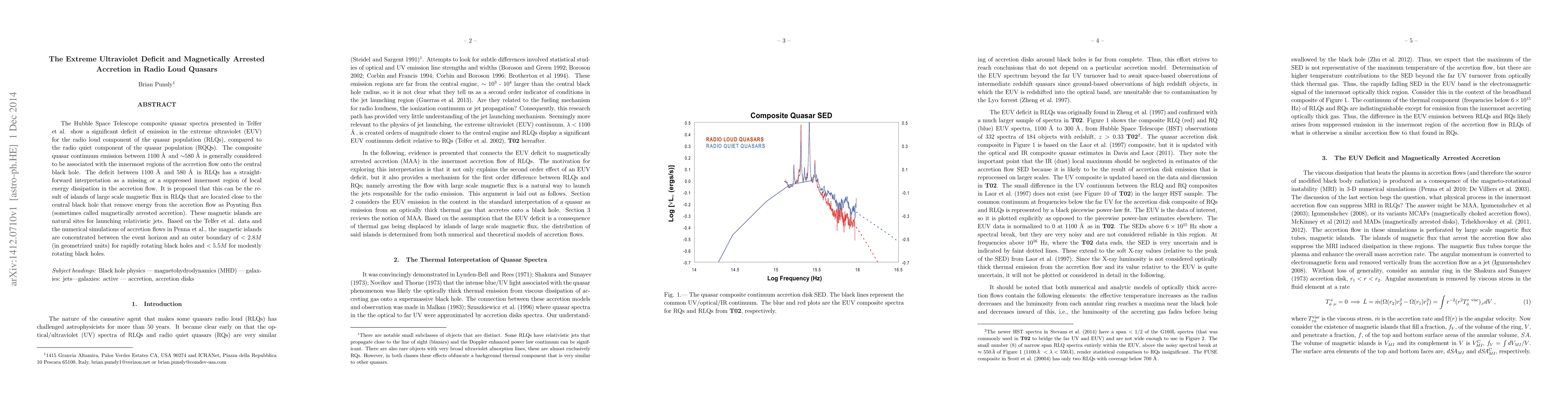 The Hubble Space Telescope composite quasar spectra presented in Telfer et al. show a significant deficit of emission in the extreme ultraviolet (EUV) for the radio loud component of the quasar population (RLQs), compared to the radio quiet component of the quasar population (RQQs). The composite quasar continuum emission between 1100 \AA\, and $\sim$580 \AA\, is generally considered to be associated with the innermost regions of the accretion flow onto the central black hole. The deficit between 1100 \AA\, and 580 \AA\, in RLQs has a straightforward interpretation as a missing or a suppressed innermost region of local energy dissipation in the accretion flow. It is proposed that this can be the result of islands of large scale magnetic flux in RLQs that are located close to the central black hole that remove energy from the accretion flow as Poynting flux (sometimes called magnetically arrested accretion). These magnetic islands are natural sites for launching relativistic jets. Based on the Telfer et al. data and the numerical simulations of accretion flows in Penna et al., the magnetic islands are concentrated between the event horizon and an outer boundary of $<2.8 M$ (in geometrized units) for rapidly rotating black holes and $< 5.5M$ for modestly rotating black holes.
