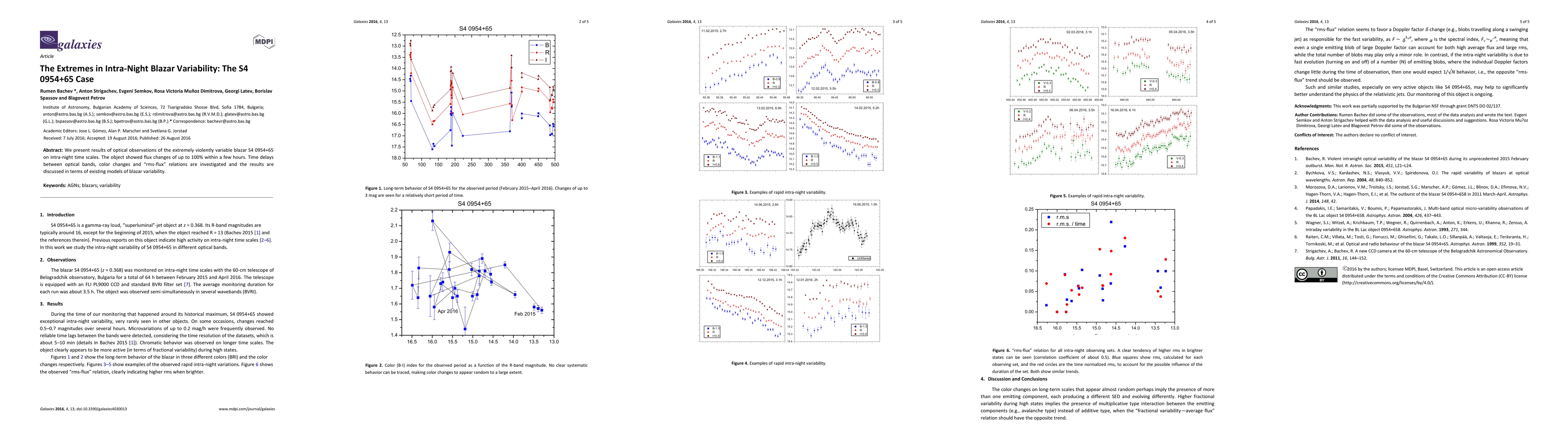 This study investigates the extreme intra-night variability of the blazar S4 0954+65, revealing flux changes of up to 100% within hours. The research examines time delays between optical bands, color changes, and "rms-flux" relations to discuss the findings in the context of existing blazar variability models.