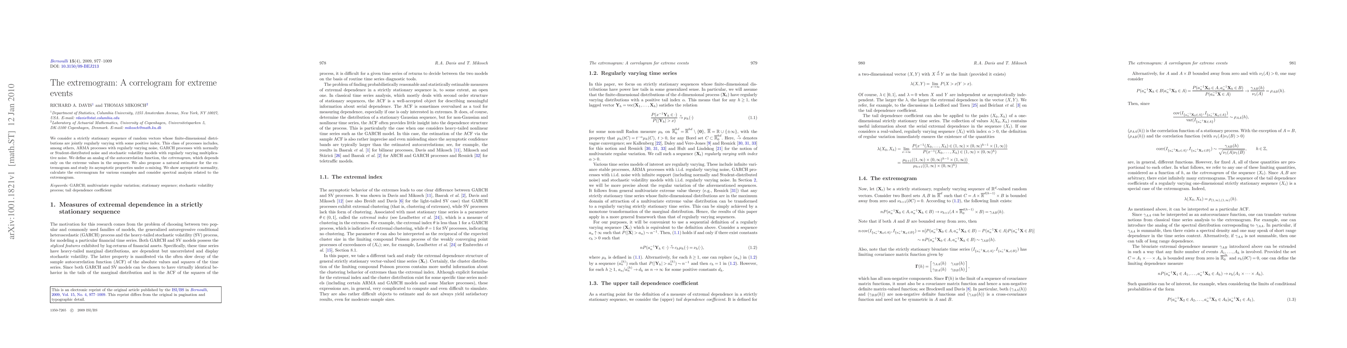 We consider a strictly stationary sequence of random vectors whose finite-dimensional distributions are jointly regularly varying with some positive index. This class of processes includes, among others, ARMA processes with regularly varying noise, GARCH processes with normally or Student-distributed noise and stochastic volatility models with regularly varying multiplicative noise. We define an analog of the autocorrelation function, the extremogram, which depends only on the extreme values in the sequence. We also propose a natural estimator for the extremogram and study its asymptotic properties under $\alpha$-mixing. We show asymptotic normality, calculate the extremogram for various examples and consider spectral analysis related to the extremogram.