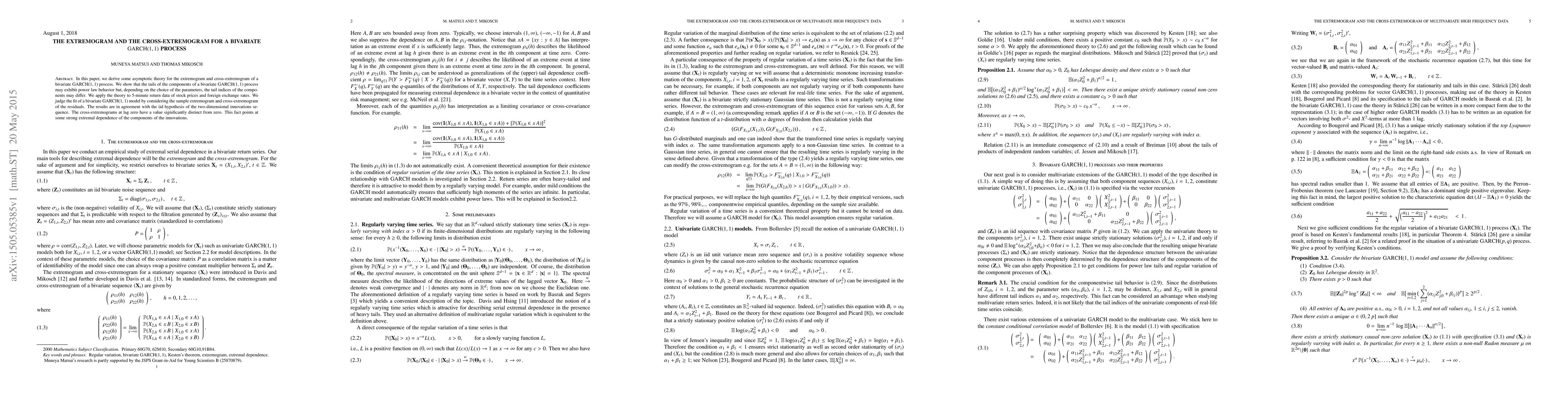 Researchers derive asymptotic theory for extremogram and cross-extremogram of a bivariate GARCH(1,1) process, finding potential power law behavior in tails but differing tail indices depending on parameters.
