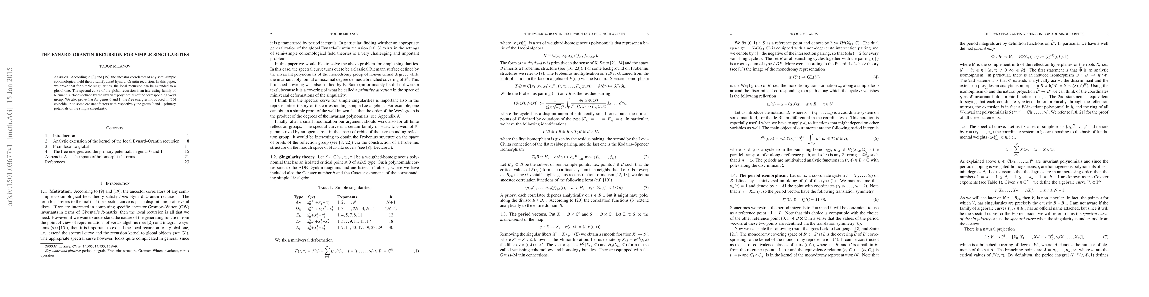 According to \cite{BOSS} and \cite{M1}, the ancestor correlators of any semi-simple cohomological field theory satisfy {\em local} Eynard--Orantin recursion. In this paper, we prove that for simple singularities, the local recursion can be extended to a global one. The spectral curve of the global recursion is an interesting family of Riemann surfaces defined by the invariant polynomials of the corresponding Weyl group. We also prove that for genus 0 and 1, the free energies introduced in \cite{EO} coincide up to some constant factors with respectively the genus 0 and 1 primary potentials of the simple singularity.