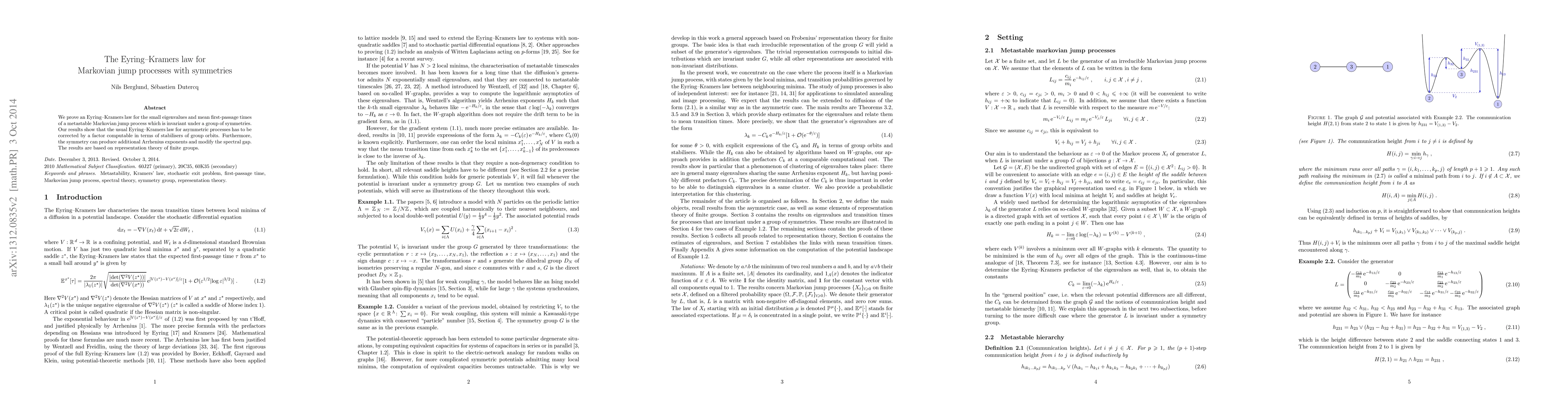This paper proves an adjusted Eyring-Kramers law for symmetric Markovian jump processes, showing that the usual law for asymmetric processes must be corrected by a factor related to group stabilizers. The symmetry can introduce extra Arrhenius exponents and alter the spectral gap, with results grounded in finite group representation theory.