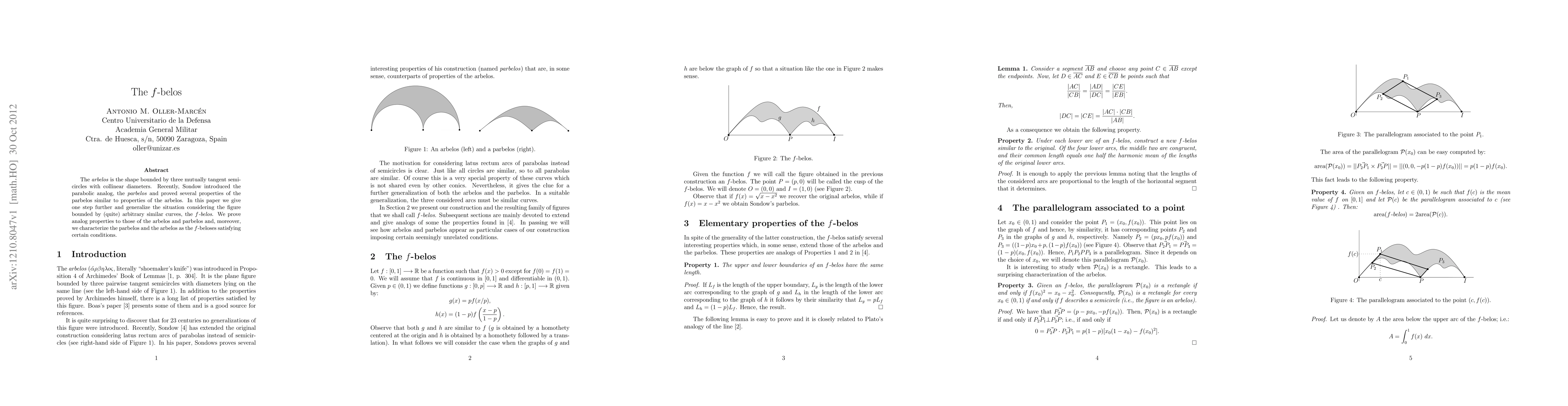 The \emph{arbelos} is the shape bounded by three mutually tangent semicircles with collinear diameters. Recently, Sondow introduced the parabolic analog, the \emph{parbelos} and proved several properties of the parbelos similar to properties of the arbelos. In this paper we give one step further and generalize the situation considering the figure bounded by (quite) arbitrary similar curves, the \emph{$f$-belos}. We prove analog properties to those of the arbelos and parbelos and, moreover, we characterize the parbelos and the arbelos as the $f$-beloses satisfying certain conditions.