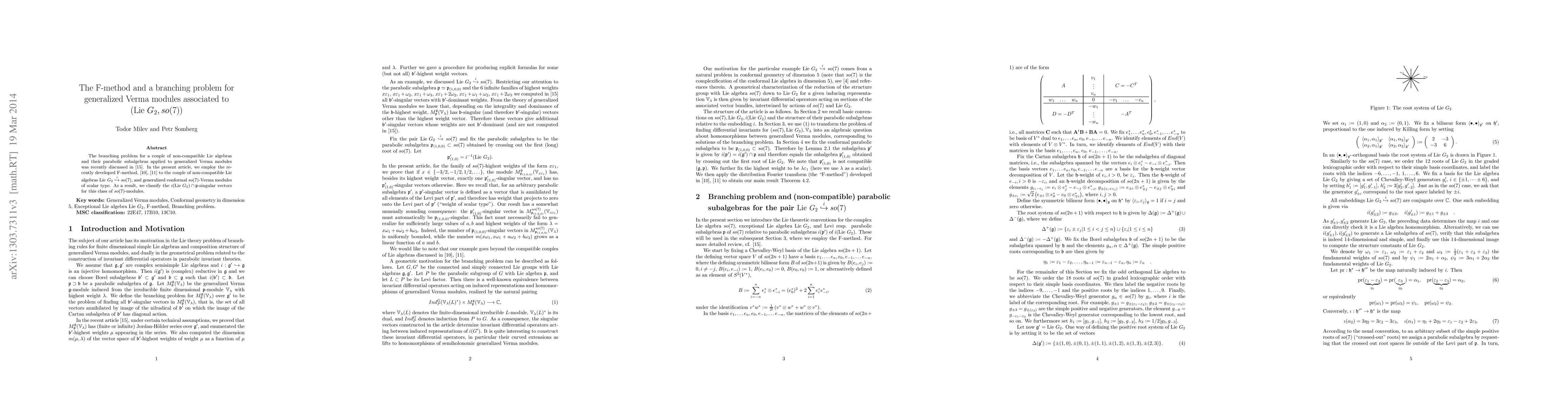 Summary: This paper uses the F-method to study the branching problem for the non-compatible Lie algebras ${\LieGtwo}$ and $so(7)$, focusing on generalized conformal $so(7)$-Verma modules. It classifies the ${\LieGtwo} \cap \gop'$-singular vectors for this class of $so(7)$-modules.