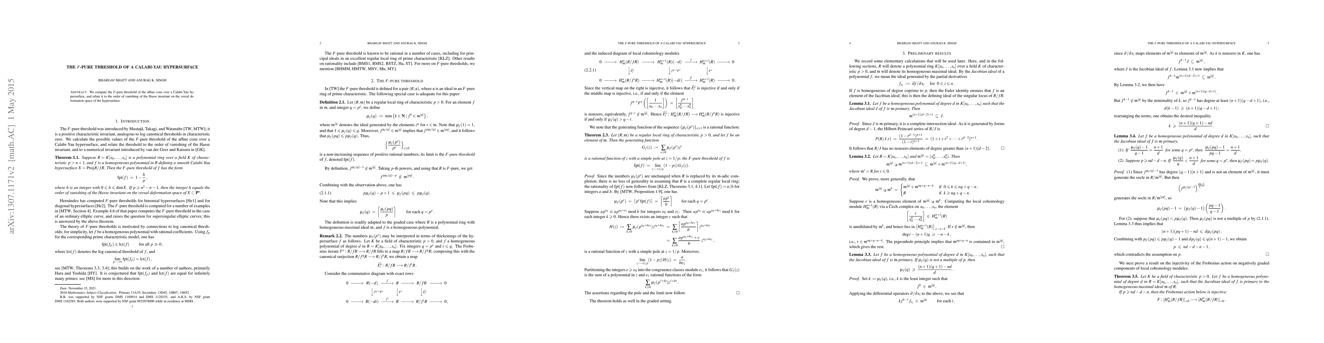 Summary: This paper computes the F-pure threshold of the affine cone over a Calabi-Yau hypersurface and connects it to the order of vanishing of the Hasse invariant on the versal deformation space, establishing a link between positive characteristic numerical invariants and classical deformation theory.