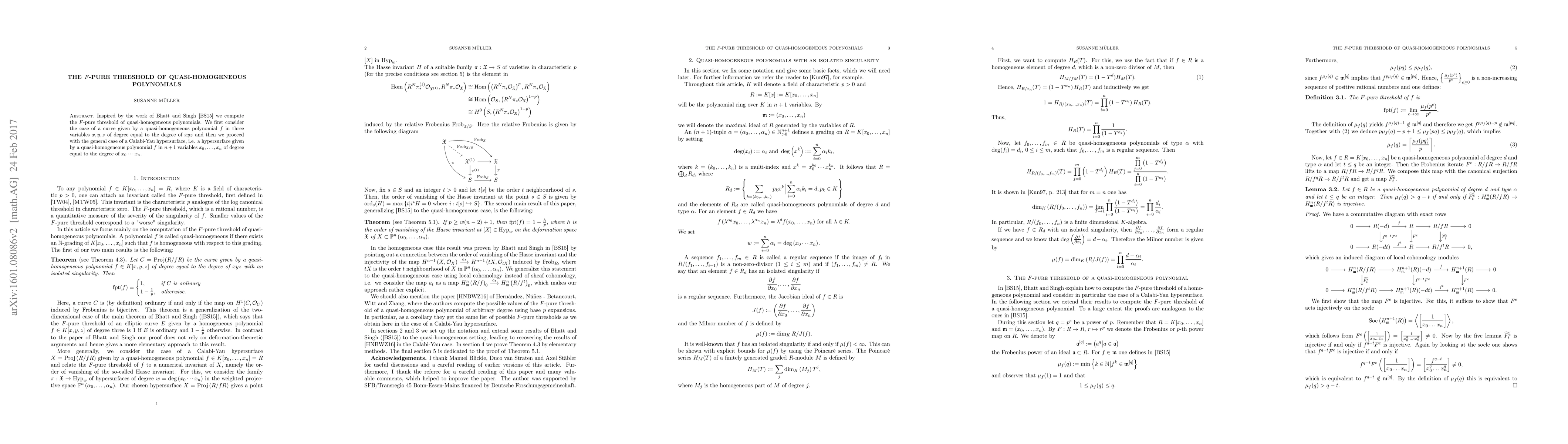 This paper computes the $F$-pure threshold for quasi-homogeneous polynomials, starting with the case of a curve defined by a quasi-homogeneous polynomial in three variables and extending to Calabi-Yau hypersurfaces in $n+1$ variables. The study is inspired by Bhatt and Singh's work on $F$-pure thresholds.