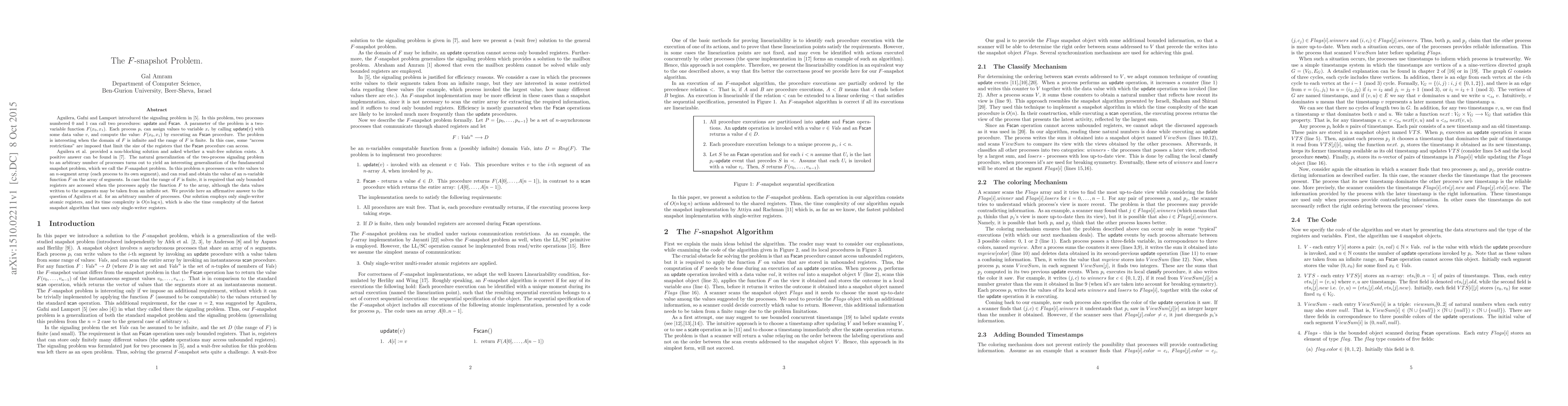 Aguilera, Gafni and Lamport introduced the signaling problem in [5]. In this problem, two processes numbered 0 and 1 can call two procedures: update and Fscan. A parameter of the problem is a two- variable function $F(x_0,x_1)$. Each process $p_i$ can assign values to variable $x_i$ by calling update(v) with some data value v, and compute the value: $F(x_0,x_1)$ by executing an Fscan procedure. The problem is interesting when the domain of $F$ is infinite and the range of $F$ is finite. In this case, some "access restrictions" are imposed that limit the size of the registers that the Fscan procedure can access. Aguilera et al. provided a non-blocking solution and asked whether a wait-free solution exists. A positive answer can be found in [7]. The natural generalization of the two-process signaling problem to an arbitrary number of processes turns out to yield an interesting generalization of the fundamental snapshot problem, which we call the F-snapshot problem. In this problem $n$ processes can write values to an $n$-segment array (each process to its own segment), and can read and obtain the value of an n-variable function $F$ on the array of segments. In case that the range of $F$ is finite, it is required that only bounded registers are accessed when the processes apply the function $F$ to the array, although the data values written to the segments may be taken from an infinite set. We provide here an affirmative answer to the question of Aguilera et al. for an arbitrary number of processes. Our solution employs only single-writer atomic registers, and its time complexity is $O(n \log n)$, which is also the time complexity of the fastest snapshot algorithm that uses only single-writer registers.