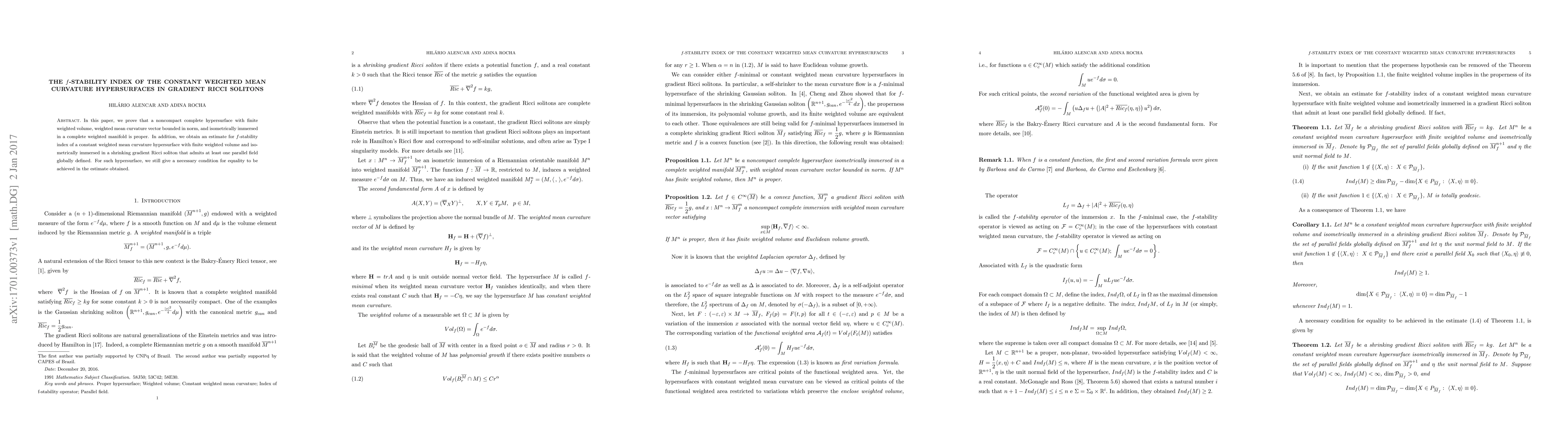 This paper proves that a noncompact complete hypersurface with bounded weighted mean curvature and finite weighted volume is proper when immersed in a complete weighted manifold. It also provides an estimate for the $f$-stability index of constant weighted mean curvature hypersurfaces in shrinking gradient Ricci solitons, along with a necessary condition for achieving equality in the estimate.