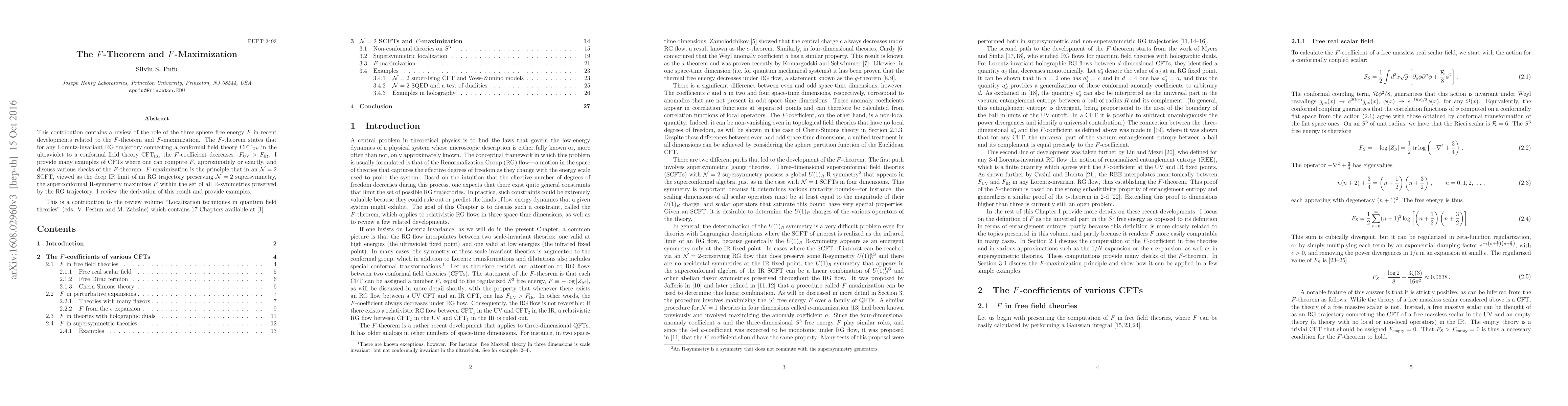 This paper reviews the F-theorem, which states that the three-sphere free energy F decreases along a Lorentz-invariant RG trajectory from a UV to an IR conformal field theory, and discusses F-maximization in N=2 SCFTs where the superconformal R-symmetry maximizes F. Examples and checks of these principles are provided.