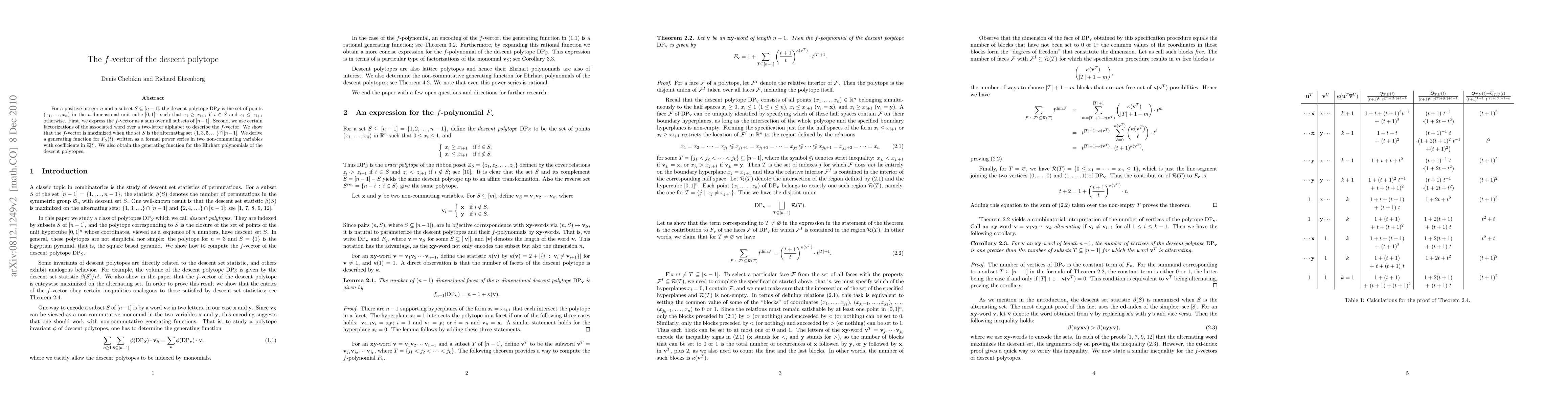 For a positive integer n and a subset S of [n-1], the descent polytope DP_S is the set of points x_1, ..., x_n in the n-dimensional unit cube [0,1]^n such that x_i >= x_{i+1} for i in S and x_i <= x_{i+1} otherwise. First, we express the f-vector of DP_S as a sum over all subsets of [n-1]. Second, we use certain factorizations of the associated word over a two-letter alphabet to describe the f-vector. We show that the f-vector is maximized when the set S is the alternating set {1,3,5, ...}. We derive a generating function for the f-polynomial F_S(t) of DP_S, written as a formal power series in two non-commuting variables with coefficients in Z[t]. We also obtain the generating function for the Ehrhart polynomials of the descent polytopes.