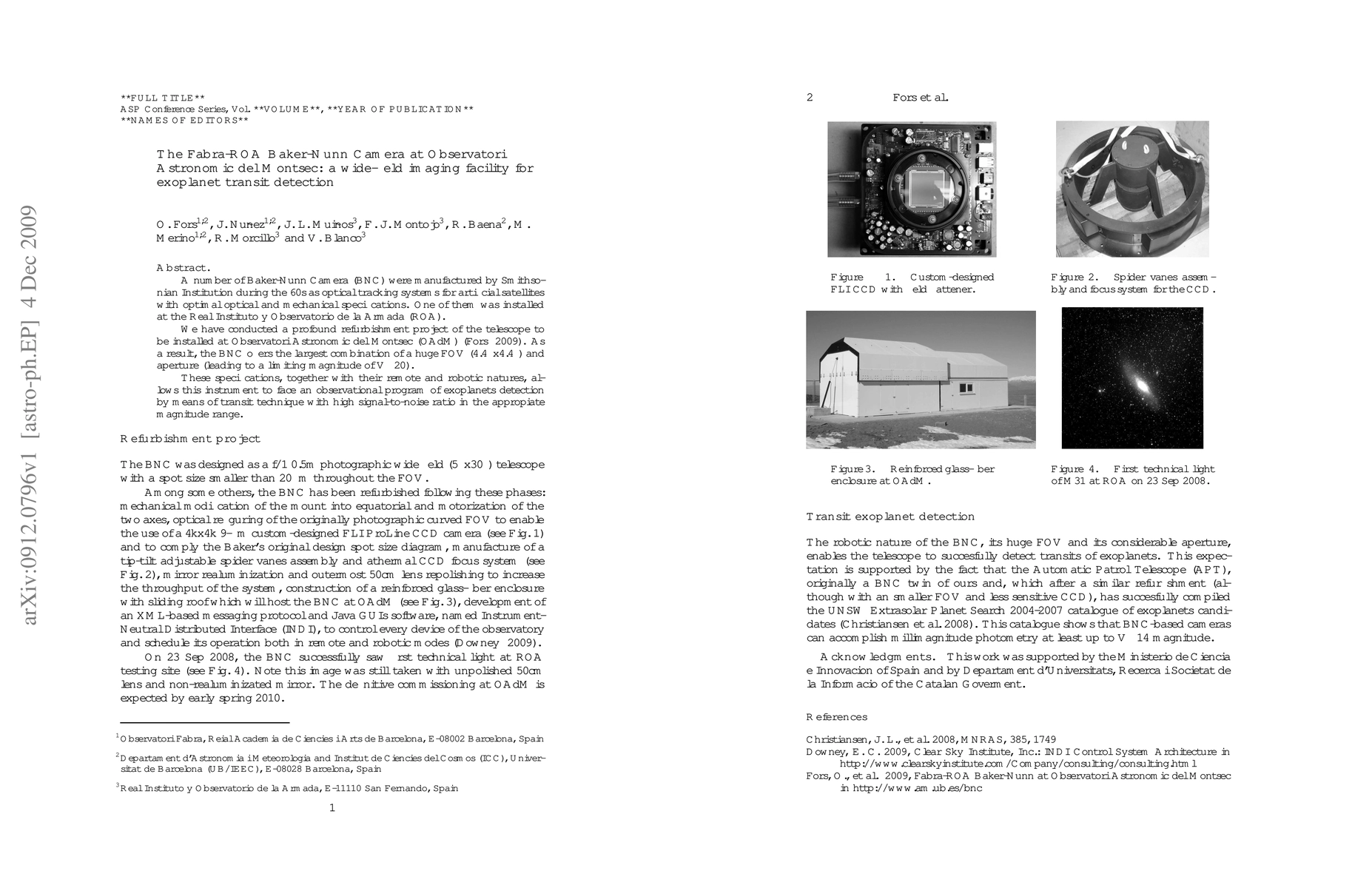 A number of Baker-Nunn Camera (BNC) were manufactured by Smithsonian Institution during the 60s as optical tracking systems for artificial satellites with optimal optical and mechanical specifications. One of them was installed at the Real Instituto y Observatorio de la Armada (ROA). We have conducted a profound refurbishment project of the telescope to be installed at Observatori Astron\`omic del Montsec (OAdM). As a result, the BNC offers the largest combination of a huge FOV (4.4$\deg$x4.4$\deg$) and aperture (leading to a limiting magnitude of V$\sim$20). These specifications, together with their remote and robotic natures, allows this instrument to face an observational program of exoplanets detection by means of transit technique with high signal-to-noise ratio in the appropiate magnitude range.