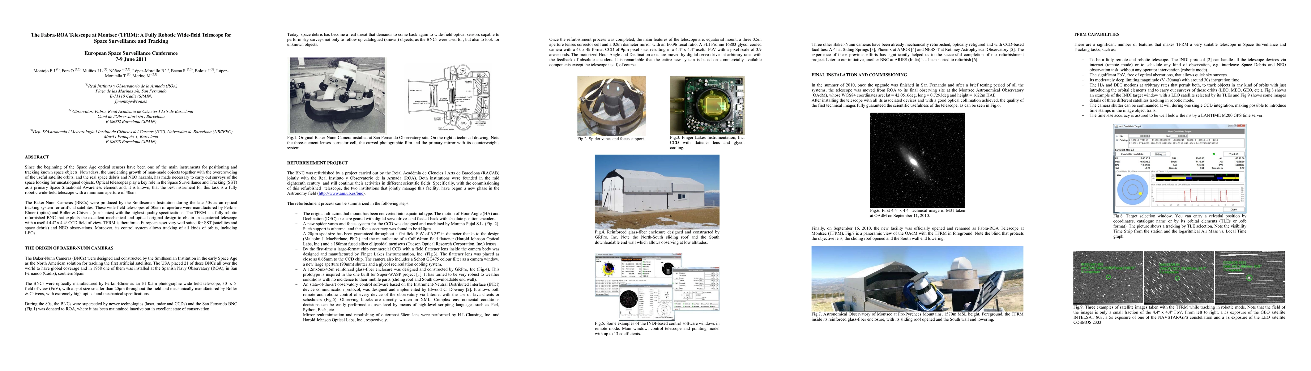 Since the beginning of the Space Age optical sensors have been one of the main instruments for positioning and tracking known space objects. Nowadays, the unrelenting growth of man-made objects together with the overcrowding of the useful satellite orbits, and the real space debris and NEO hazards, has made necessary to carry out surveys of the space looking for uncatalogued objects. Optical telescopes play a key role in the Space Surveillance and Tracking (SST) as a primary Space Situational Awareness element and, it is known, that the best instrument for this task is a fully robotic wide-field telescope with a minimum aperture of 40cm. The Baker-Nunn Cameras (BNCs) were produced by the Smithsonian Institution during the late 50s as an optical tracking system for artificial satellites. These wide-field telescopes of 50cm of aperture were manufactured by Perkin- Elmer (optics) and Boller & Chivens (mechanics) with the highest quality specifications. The TFRM is a fully robotic refurbished BNC that exploits the excellent mechanical and optical original design to obtain an equatorial telescope with a useful 4.4{\deg}x4.4{\deg} CCD field of view. TFRM is therefore a European asset very well suited for SST (satellites and space debris) and NEO observations. Moreover, its control system allows tracking of all kinds of orbits, including LEOs.