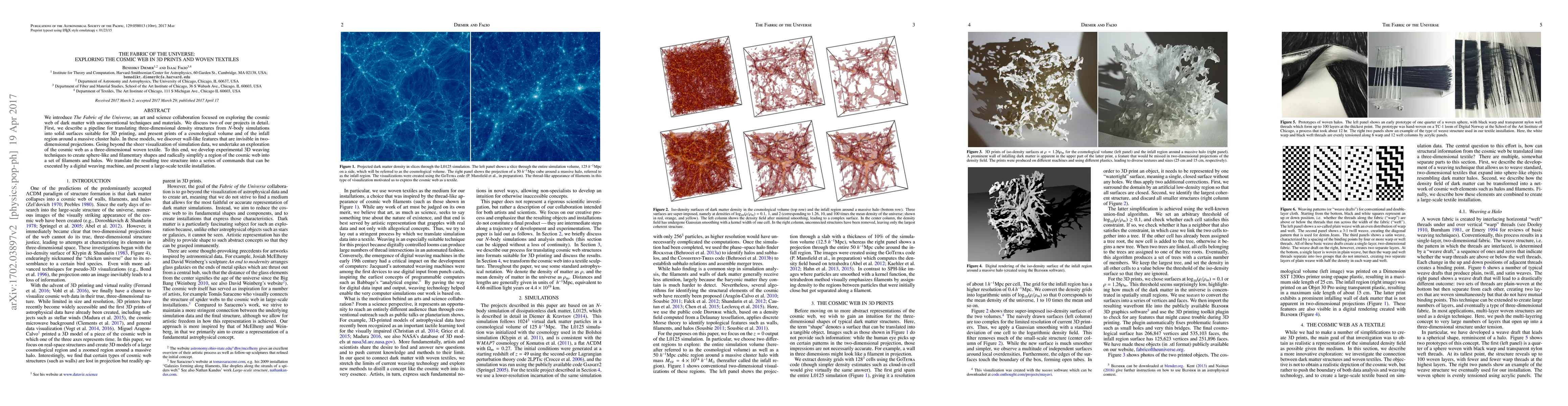 We introduce The Fabric of the Universe, an art and science collaboration focused on exploring the cosmic web of dark matter with unconventional techniques and materials. We discuss two of our projects in detail. First, we describe a pipeline for translating three-dimensional (3D) density structures from N-body simulations into solid surfaces suitable for 3D printing, and present prints of a cosmological volume and of the infall region around a massive cluster halo. In these models, we discover wall-like features that are invisible in two-dimensional projections. Going beyond the sheer visualization of simulation data, we undertake an exploration of the cosmic web as a three-dimensional woven textile. To this end, we develop experimental 3D weaving techniques to create sphere-like and filamentary shapes and radically simplify a region of the cosmic web into a set of filaments and halos. We translate the resulting tree structure into a series of commands that can be executed by a digital weaving machine, and present a large-scale textile installation.