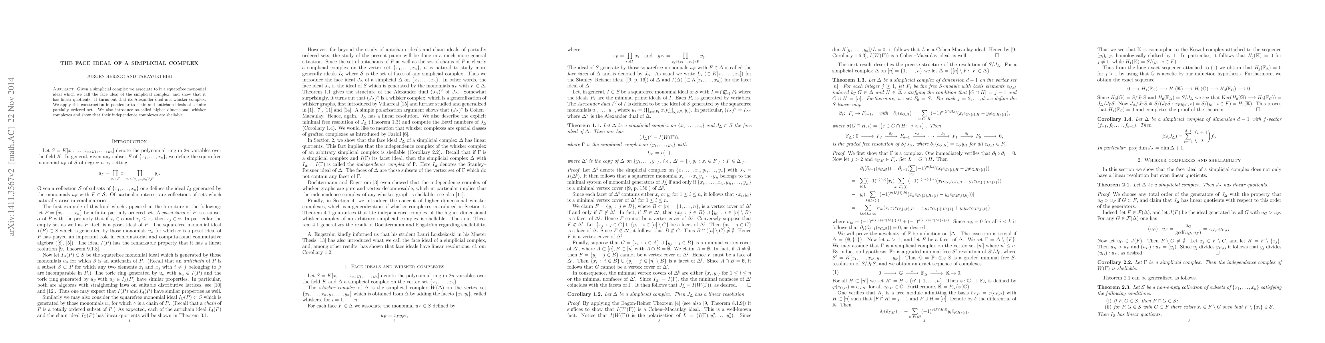 This paper associates a squarefree monomial ideal, called the face ideal, to a simplicial complex and demonstrates its linear quotients. It also reveals that the Alexander dual is a whisker complex and applies these findings to chain and antichain ideals of partially ordered sets, introducing higher dimensional whisker complexes with shellable independence complexes.