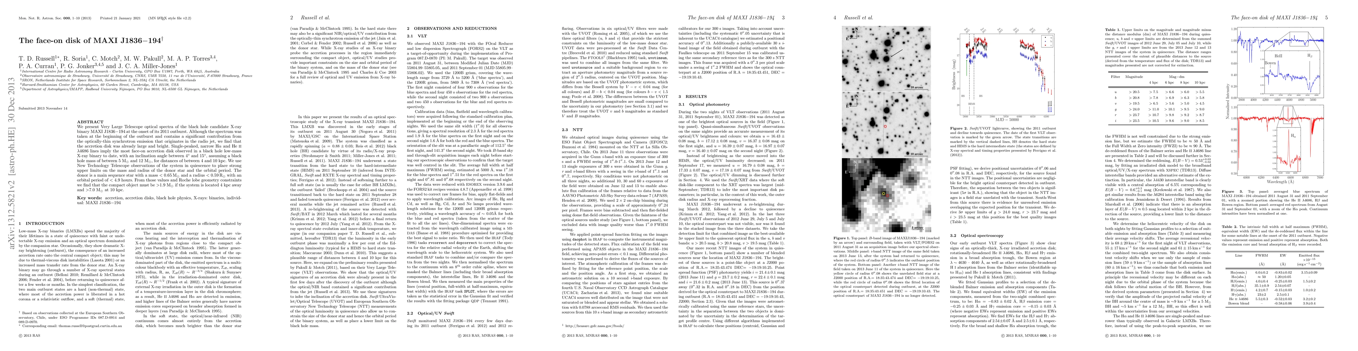 We present Very Large Telescope optical spectra of the black hole candidate X-ray binary MAXI J1836-194 at the onset of its 2011 outburst. Although the spectrum was taken at the beginning of the outburst and contains a significant contribution from the optically-thin synchrotron emission that originates in the radio jet, we find that the accretion disk was already large and bright. Single-peaked, narrow H$\alpha$ and He II $\lambda$4686 lines imply the most face-on accretion disk observed in a black hole low-mass X-ray binary to date, with an inclination angle between 4$^{\circ}$ and 15$^{\circ}$, assuming a black hole mass of between 5 M$_\odot$ and 12 M$_\odot$, for distances of between 4 and 10 kpc. We use New Technology Telescope observations of the system in quiescence to place strong upper limits on the mass and radius of the donor star and the orbital period. The donor is a main sequence star with a mass < 0.65 M$_{\odot}$ and a radius < 0.59 R$_{\odot}$ with an orbital period of < 4.9 hours. From those values and Roche lobe geometry constraints we find that the compact object must be >1.9 M$_{\odot}$ if the system is located 4 kpc away and >7.0 M$_{\odot}$ at 10 kpc.