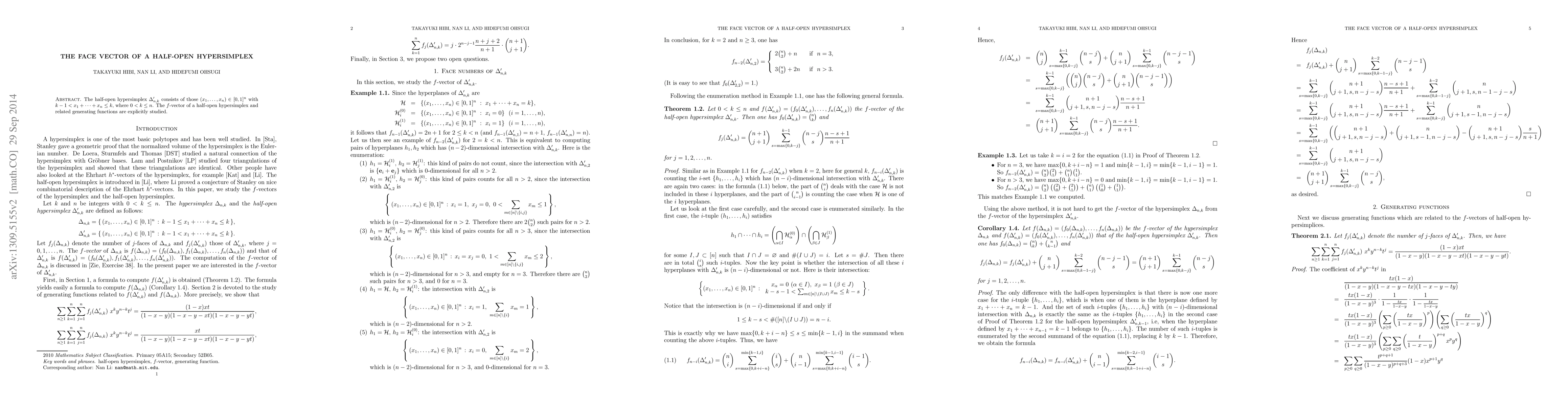 The paper presents explicit formulas for the $f$-vector of half-open hypersimplices and their related generating functions, along with a proof of these results using enumeration methods.