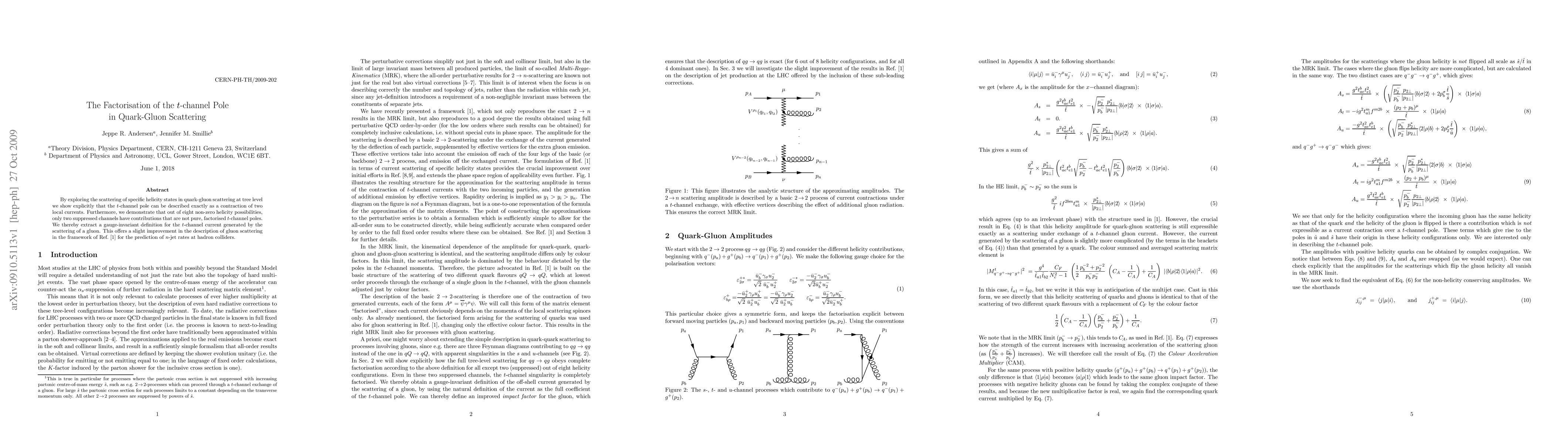 By exploring the scattering of specific helicity states in quark-gluon scattering at tree level we show explicitly that the t-channel pole can be described exactly as a contraction of two local currents. Furthermore, we demonstrate that out of eight non-zero helicity possibilities, only two suppressed channels have contributions that are not pure, factorised t-channel poles. We thereby extract a gauge-invariant definition for the t-channel current generated by the scattering of a gluon. This offers a slight improvement in the description of gluon scattering in the framework of arXiv:0908.2786 for the prediction of n-jet rates at hadron colliders.