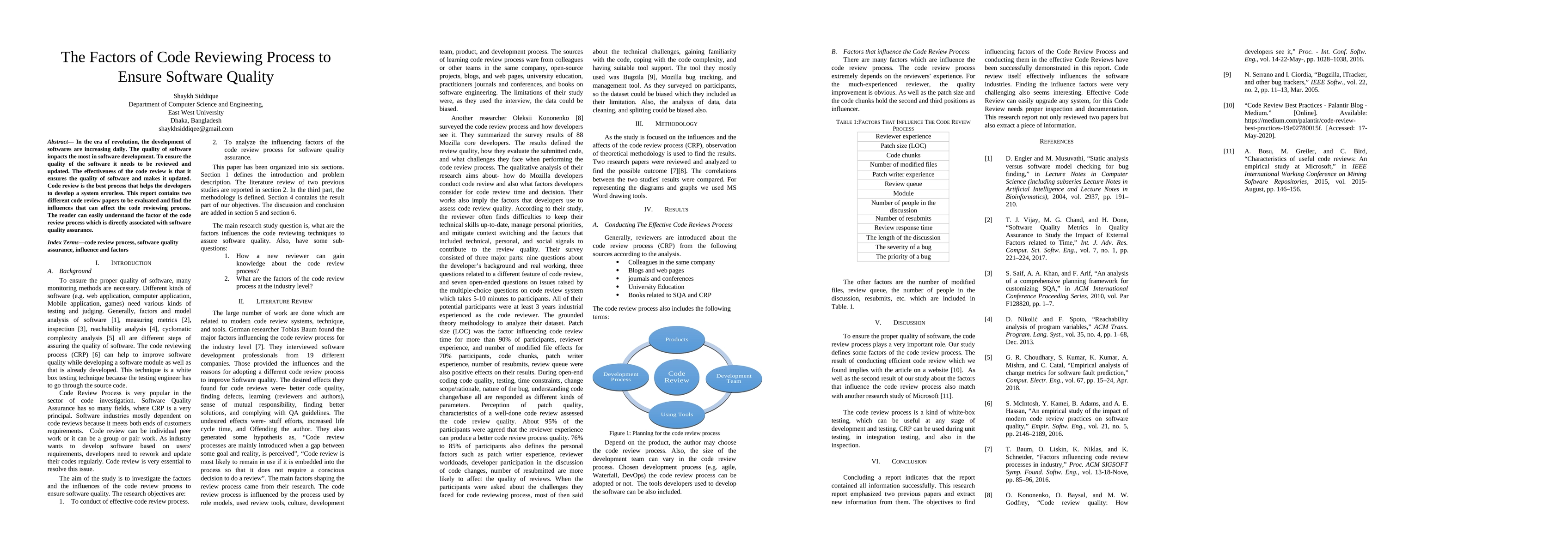 In the era of revolution, the development of softwares are increasing daily. The quality of software impacts the most in software development. To ensure the quality of the software it needs to be reviewed and updated. The effectiveness of the code review is that it ensures the quality of software and makes it updated. Code review is the best process that helps the developers to develop a system errorless. This report contains two different code review papers to be evaluated and find the influences that can affect the code reviewing process. The reader can easily understand the factor of the code review process which is directly associated with software quality assurance.