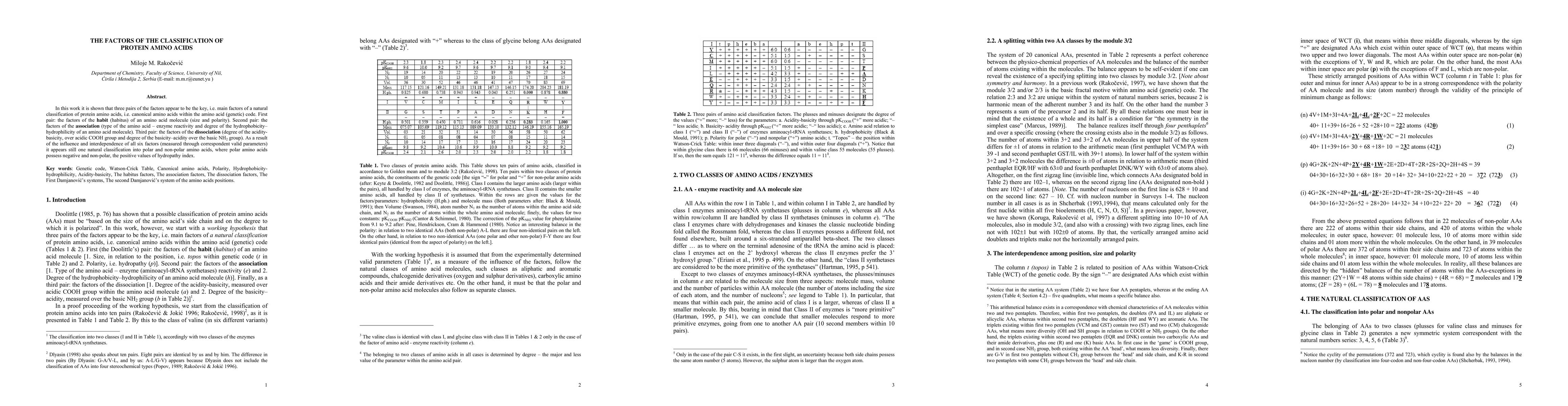 This paper identifies three key pairs of factors for classifying protein amino acids: size and polarity, association and enzyme reactivity, and dissociation concerning acidity-basicity. The interplay of these factors results in a natural classification into polar and non-polar amino acids based on their hydropathy index.