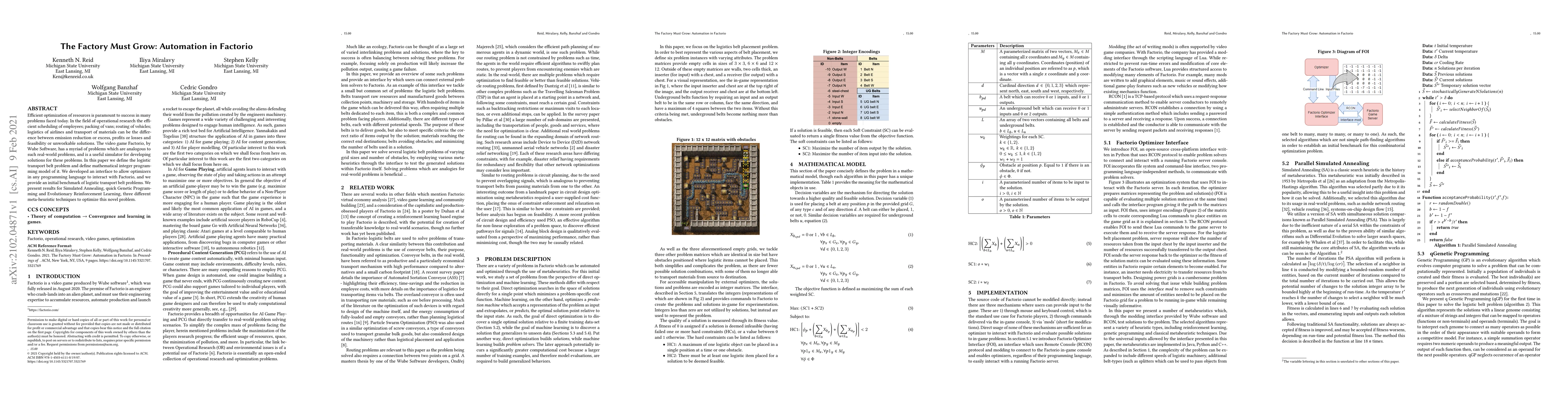 Efficient optimization of resources is paramount to success in many problems faced today. In the field of operational research the efficient scheduling of employees; packing of vans; routing of vehicles; logistics of airlines and transport of materials can be the difference between emission reduction or excess, profits or losses and feasibility or unworkable solutions. The video game Factorio, by Wube Software, has a myriad of problems which are analogous to such real-world problems, and is a useful simulator for developing solutions for these problems. In this paper we define the logistic transport belt problem and define mathematical integer programming model of it. We developed an interface to allow optimizers in any programming language to interact with Factorio, and we provide an initial benchmark of logistic transport belt problems. We present results for Simulated Annealing, quick Genetic Programming and Evolutionary Reinforcement Learning, three different meta-heuristic techniques to optimize this novel problem.