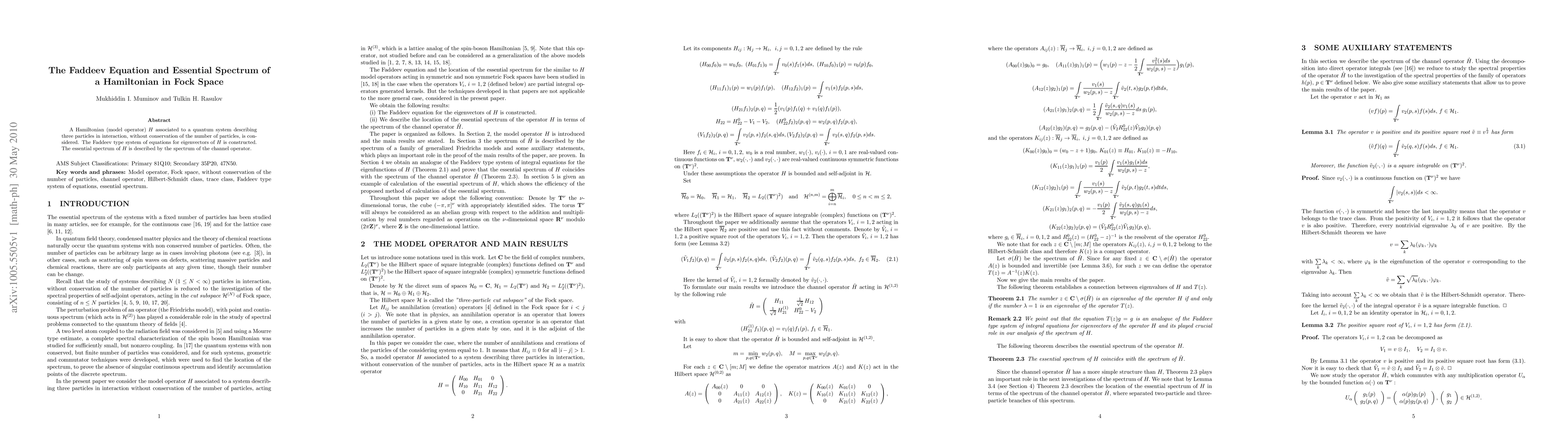 A Hamiltonian (model operator) $H$ associated to a quantum system describing three particles in interaction, without conservation of the number of particles, is considered. The Faddeev type system of equations for eigenvectors of $H$ is constructed. The essential spectrum of $H$ is described by the spectrum of the channel operator.