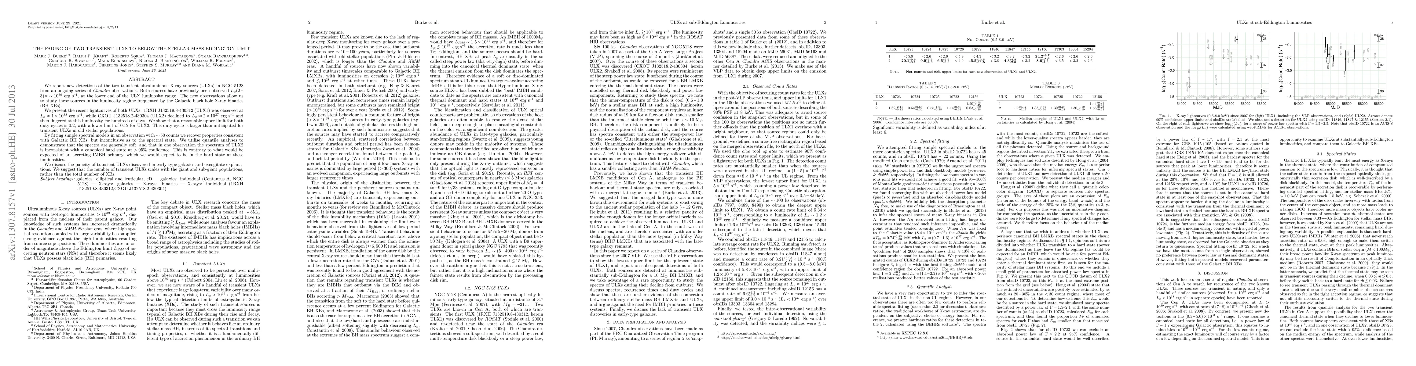 We report new detections of the two transient ultraluminous X-ray sources (ULXs) in NGC 5128 from an ongoing series of Chandra observations. Both sources have previously been observed Lx (2-3)E39 erg/s, at the lower end of the ULX luminosity range. The new observations allow us to study these sources in the luminosity regime frequented by the Galactic black hole X-ray binaries (BH XBs). We present the recent lightcurves of both ULXs. 1RXH J132519.8-430312 (ULX1) was observed at Lx ~ 1E38 erg/s, while CXOU J132518.2-430304 (ULX2) declined to Lx ~ 2E37 erg/s and then lingered at this luminosity for hundreds of days. We show that a reasonable upper limit for both duty cycles is 0.2, with a lower limit of 0.12 for ULX2. This duty cycle is larger than anticipated for transient ULXs in old stellar populations. By fitting simple spectral models in an observation with ~50 counts we recover properties consistent with Galactic BH XBs, but inconclusive as to the spectral state. We utilise quantile analyses to demonstrate that the spectra are generally soft, and that in one observation the spectrum of ULX2 is inconsistent with a canonical hard state at >95% confidence. This is contrary to what would be expected of an accreting IMBH primary, which we would expect to be in the hard state at these luminosities. We discuss the paucity of transient ULXs discovered in early-type galaxies and excogitate explanations. We suggest that the number of transient ULXs scales with the giant and sub-giant populations, rather than the total number of XBs.