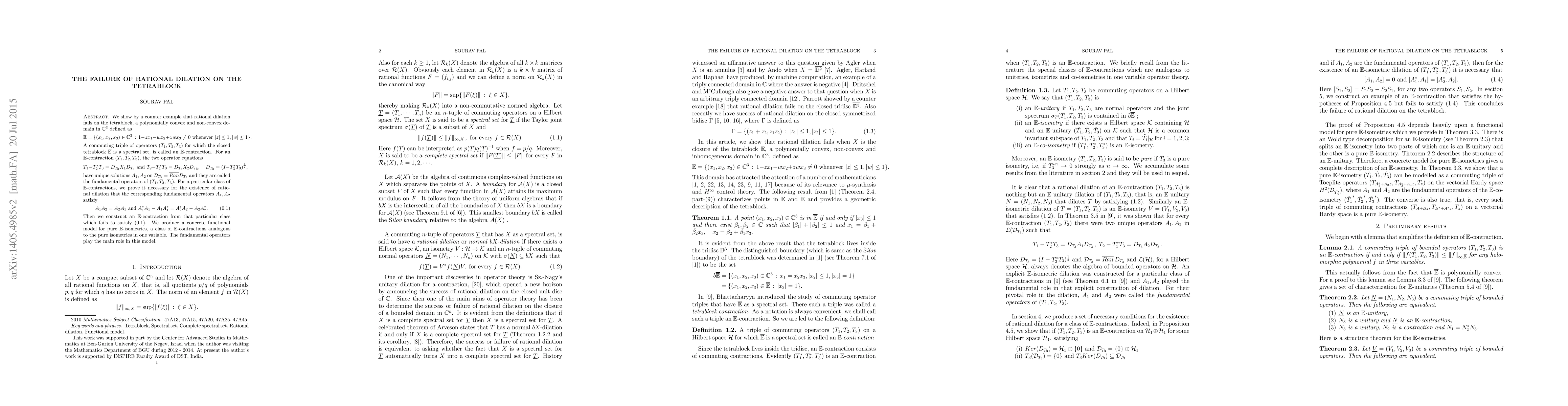 We show by a counter example the failure of rational dilation on the tetrablock, a polynomially convex and non-convex domain in $\mathbb C^3$, defined as $$ \mathbb E = \{ (x_1,x_2,x_3)\in\mathbb C^3\,:\, 1-zx_1-wx_2+zwx_3\neq 0 \textup{ whenever } |z|\leq 1, |w|\leq 1 \}. $$ A commuting triple of operators $(T_1,T_2,T_3)$ for which the closed tetrablock $\overline{\mathbb E}$ is a spectral set, is called an $\mathbb E$-contraction. For an $\mathbb E$-contraction $(T_1,T_2,T_3)$, the two operator equations $$ T_1-T_2^*T_3=D_{T_3}X_1D_{T_3} \textup{ and } T_2-T_1^*T_3= D_{T_3}X_2D_{T_3}, \quad D_{T_3}=(I-T_3^*T_3)^{\frac{1}{2}},$$ have unique solutions $A_1,A_2$ on $\mathcal D_{T_3}=\overline{Ran} D_{T_3}$ and they are called the fundamental operators of $(T_1,T_2,T_3)$. For a particular class of $\mathbb E$-contractions, we prove it necessary for the existence of rational dilation that the corresponding fundamental operators $A_1,A_2$ satisfy the conditions \begin{equation}\label{abstract} A_1A_2=A_2A_1 \textup{ and } A_1^*A_1-A_1A_1^*=A_2^*A_2-A_2A_2^*. \end{equation} Then we construct an $\mathbb E$-contraction from that particular class which fails to satisfy (\ref{abstract}). We produce a concrete functional model for pure $\mathbb E$-isometries, a class of $E$-contractions analogous to the pure isometries in one variable. The fundamental operators play the main role in this model.