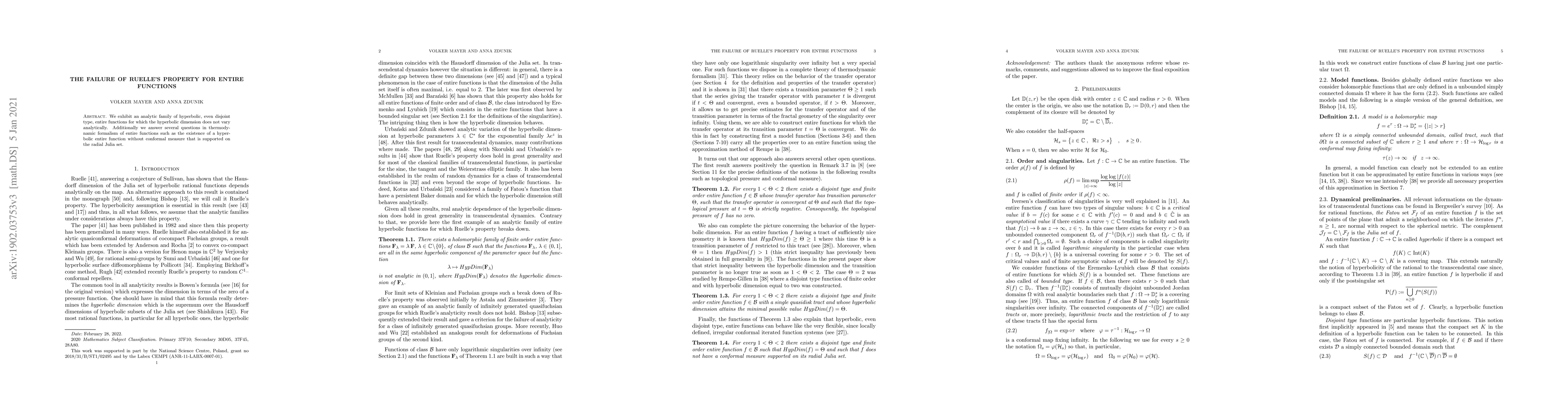 Researchers have created an analytic family of entire functions that break Ruelle's property, showing a hyperbolic dimension that doesn't change analytically. This discovery also sheds light on the existence of hyperbolic entire functions without conformal measure supported on the radial Julia set.