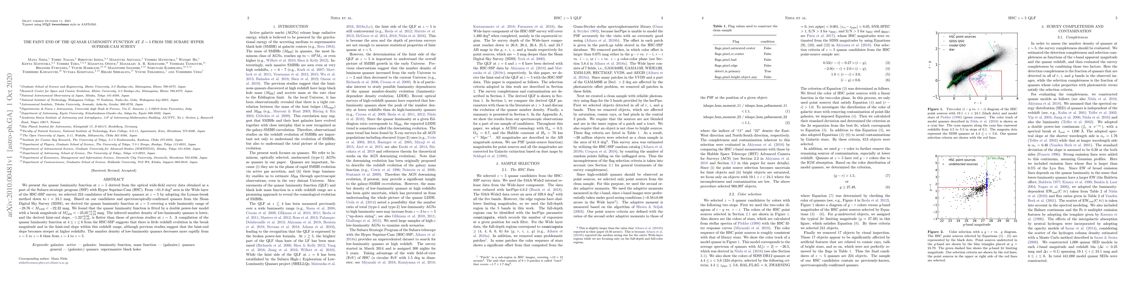This study derives the quasar luminosity function at $z \sim 5$ from Subaru Hyper Suprime-Cam data, revealing a flatter faint-end slope and lower number density of low-luminosity quasars compared to previous studies, with little redshift evolution in the break magnitude and faint-end slope from $z \sim 4$ to $z \sim 6$.