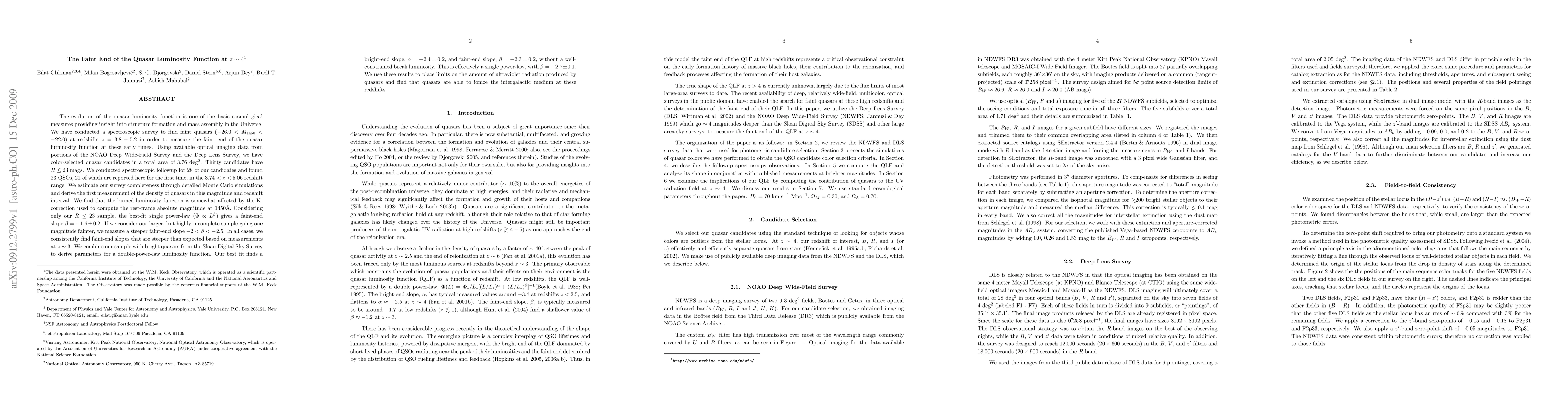 This study conducted a spectroscopic survey to identify faint quasars (-26.0 < M_{1450} < -22.0) at redshifts z=3.8-5.2, aiming to measure the faint end of the quasar luminosity function at early times. Optical imaging data from the NOAO Deep Wide-Field Survey and the Deep Lens Survey were used to color-select quasar candidates over a total area of 3.76 deg^2. Spectroscopic follow-up was performed on 28 out of 30 candidates, confirming 23 quasars, 21 of which were reported for the first time.