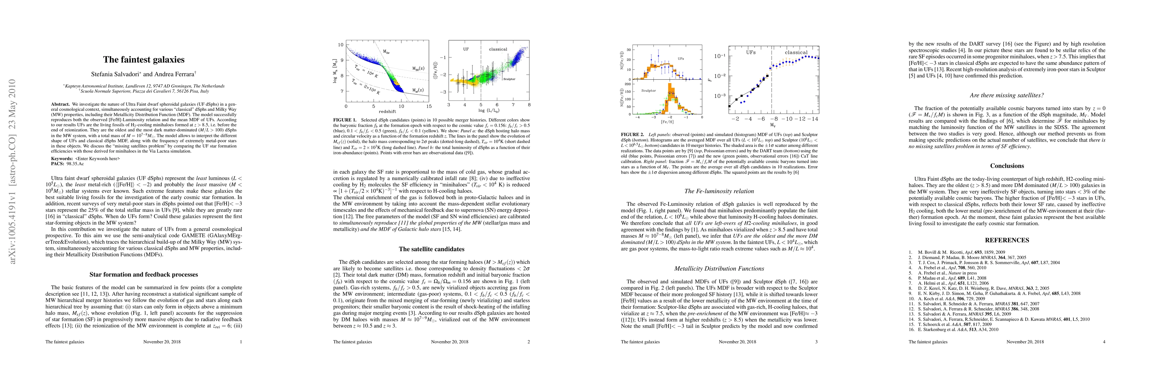We investigate the nature of Ultra Faint dwarf spheroidal galaxies (UF dSphs) in a general cosmological context, simultaneously accounting for various "classical" dSphs and Milky Way (MW) properties, including their Metallicity Distribution Function (MDF). The model successfully reproduces both the observed [Fe/H]-Luminosity relation and the mean MDF of UFs. According to our results UFs are the living fossils of H2-cooling minihaloes formed at z>8.5, i.e. before the end of reionization. They are the oldest and the most dark matter-dominated (M/L > 100) dSphs in the MW system, with a total mass of M = 10^(7-8) Msun. The model allows to interpret the different shape of UFs and classical dSphs MDF, along with the frequency of extremely metal-poor stars in these objects. We discuss the "missing satellites problem" by comparing the UF star formation efficiencies with those derived for minihaloes in the Via Lactea simulation.