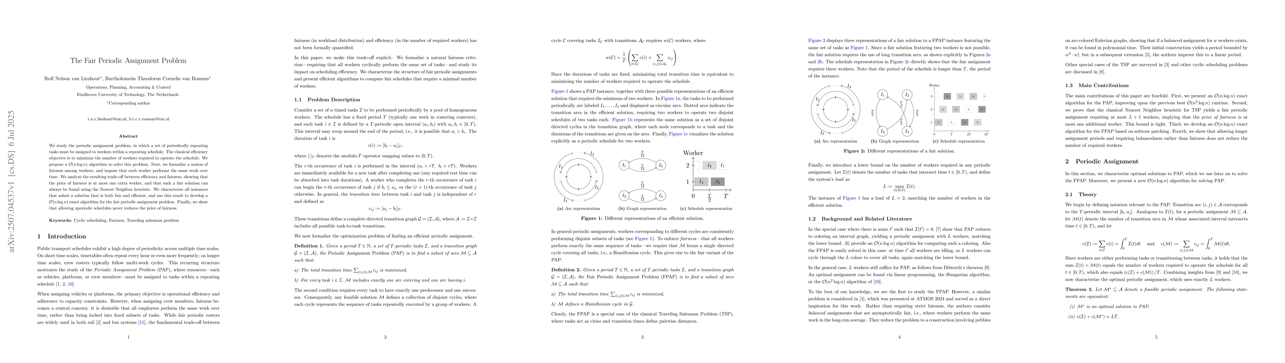 We study the periodic assignment problem, in which a set of periodically repeating tasks must be assigned to workers within a repeating schedule. The classical efficiency objective is to minimize the number of workers required to operate the schedule. We propose a O(n log n) algorithm to solve this problem. Next, we formalize a notion of fairness among workers, and impose that each worker performs the same work over time. We analyze the resulting trade-off between efficiency and fairness, showing that the price of fairness is at most one extra worker, and that such a fair solution can always be found using the Nearest Neighbor heuristic. We characterize all instances that admit a solution that is both fair and efficient, and use this result to develop a O(n log n) exact algorithm for the fair periodic assignment problem. Finally, we show that allowing aperiodic schedules never reduces the price of fairness.