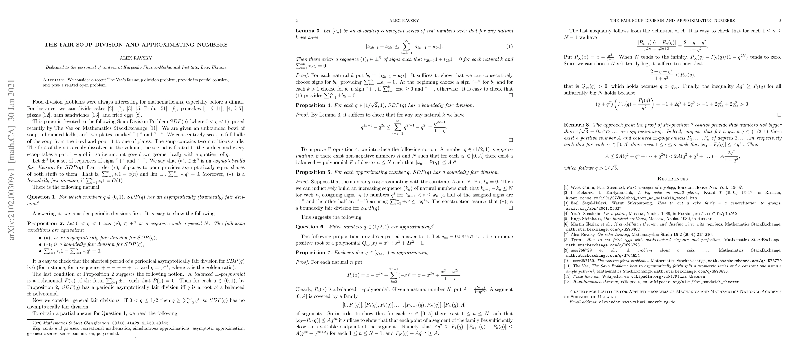 The paper provides a partial solution to Vee's fair soup division problem and poses an open related problem, focusing on key findings and implications for approximating numbers in this context.