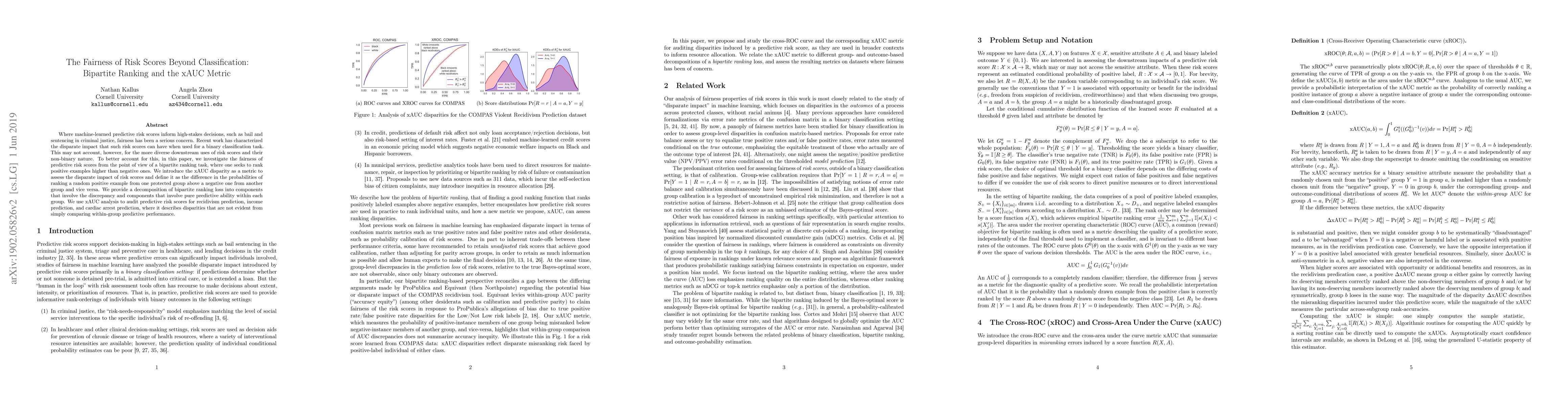 Where machine-learned predictive risk scores inform high-stakes decisions, such as bail and sentencing in criminal justice, fairness has been a serious concern. Recent work has characterized the disparate impact that such risk scores can have when used for a binary classification task. This may not account, however, for the more diverse downstream uses of risk scores and their non-binary nature. To better account for this, in this paper, we investigate the fairness of predictive risk scores from the point of view of a bipartite ranking task, where one seeks to rank positive examples higher than negative ones. We introduce the xAUC disparity as a metric to assess the disparate impact of risk scores and define it as the difference in the probabilities of ranking a random positive example from one protected group above a negative one from another group and vice versa. We provide a decomposition of bipartite ranking loss into components that involve the discrepancy and components that involve pure predictive ability within each group. We use xAUC analysis to audit predictive risk scores for recidivism prediction, income prediction, and cardiac arrest prediction, where it describes disparities that are not evident from simply comparing within-group predictive performance.