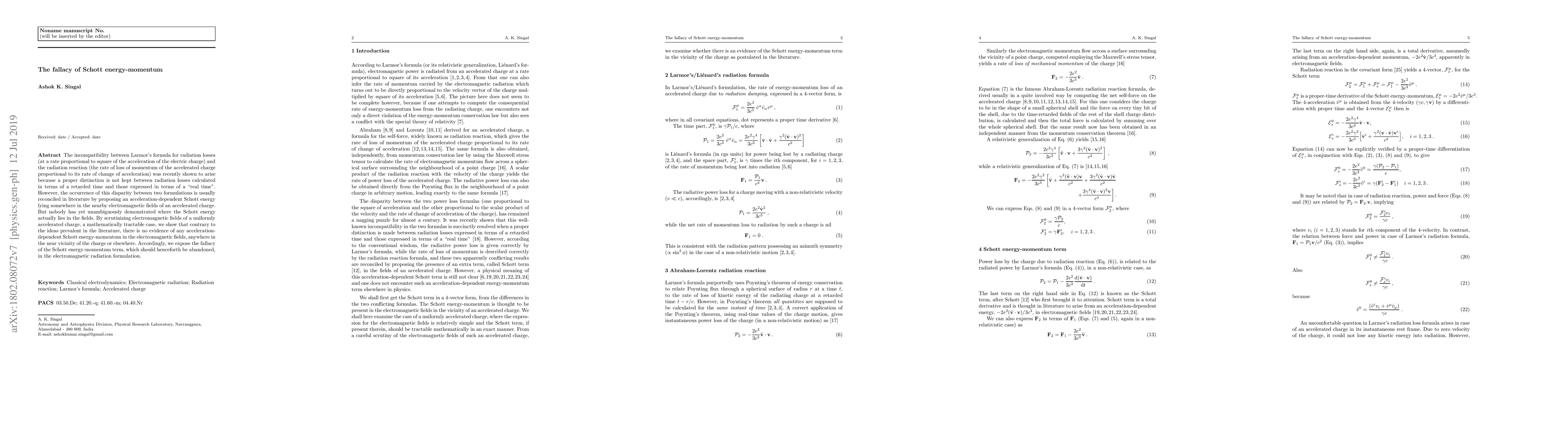 The incompatibility between Larmor's formula for radiation losses (at a rate proportional to square of the acceleration of the electric charge) and the radiation reaction (the rate of loss of momentum of the accelerated charge proportional to its rate of change of acceleration) was recently shown to arise because a proper distinction is not kept between radiation losses calculated in terms of a retarded time and those expressed in terms of a "real time". However, the occurrence of this disparity between two formulations is usually reconciled in literature by proposing an acceleration-dependent Schott energy lying somewhere in the nearby electromagnetic fields of an accelerated charge. But nobody has yet unambiguously demonstrated where the Schott energy actually lies in the fields. By scrutinizing electromagnetic fields of a uniformly accelerated charge, a mathematically tractable case, we show that contrary to the ideas prevalent in the literature, there is no evidence of any acceleration-dependent Schott energy-momentum in the electromagnetic fields, anywhere in the near vicinity of the charge or elsewhere. Accordingly, we expose the fallacy of the Schott energy-momentum term, which should henceforth be abandoned, in the electromagnetic radiation formulation.