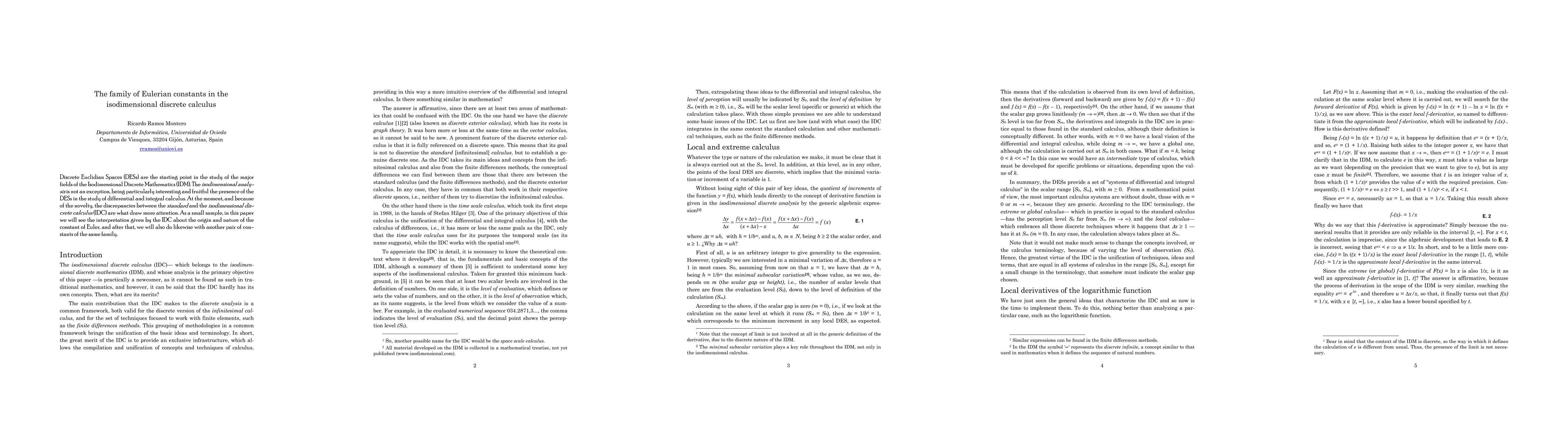 Discrete Euclidian Spaces (DESs) are the starting point in the study of the major fields of the Isodimensional Discrete Mathematics (IDM). The isodimensional analysis is not an exception, being particularly interesting and fruitful the presence of the DESs in the study of differential and integral calculus. At the moment, and because of the novelty, the discrepancies between the standard and the isodimensional discrete calculus (IDC) are what draw more attention. As a small sample, in this paper we will see the interpretation given by the IDC about the origin and nature of the constant of Euler, and after that, we will also do likewise with another pair of constants of the same family.