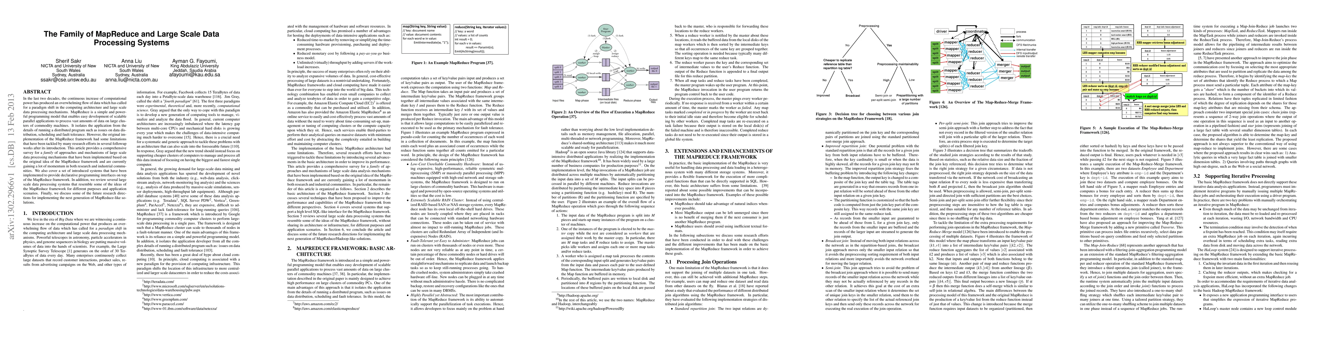 In the last two decades, the continuous increase of computational power has produced an overwhelming flow of data which has called for a paradigm shift in the computing architecture and large scale data processing mechanisms. MapReduce is a simple and powerful programming model that enables easy development of scalable parallel applications to process vast amounts of data on large clusters of commodity machines. It isolates the application from the details of running a distributed program such as issues on data distribution, scheduling and fault tolerance. However, the original implementation of the MapReduce framework had some limitations that have been tackled by many research efforts in several followup works after its introduction. This article provides a comprehensive survey for a family of approaches and mechanisms of large scale data processing mechanisms that have been implemented based on the original idea of the MapReduce framework and are currently gaining a lot of momentum in both research and industrial communities. We also cover a set of introduced systems that have been implemented to provide declarative programming interfaces on top of the MapReduce framework. In addition, we review several large scale data processing systems that resemble some of the ideas of the MapReduce framework for different purposes and application scenarios. Finally, we discuss some of the future research directions for implementing the next generation of MapReduce-like solutions.