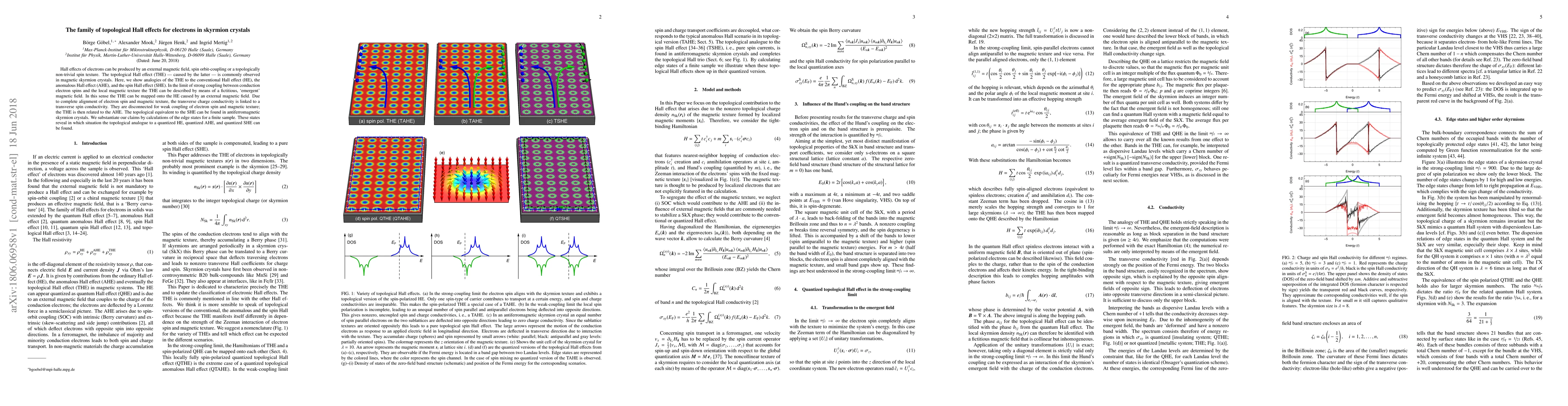 Hall effects of electrons can be produced by an external magnetic field, spin orbit-coupling or a topologically non-trivial spin texture. The topological Hall effect (THE) - caused by the latter - is commonly observed in magnetic skyrmion crystals. Here, we show analogies of the THE to the conventional Hall effect (HE), the anomalous Hall effect (AHE), and the spin Hall effect (SHE). In the limit of strong coupling between conduction electron spins and the local magnetic texture the THE can be described by means of a fictitious, 'emergent' magnetic field. In this sense the THE can be mapped onto the HE caused by an external magnetic field. Due to complete alignment of electron spin and magnetic texture, the transverse charge conductivity is linked to a transverse spin conductivity. They are disconnected for weak coupling of electron spin and magnetic texture; the THE is then related to the AHE. The topological equivalent to the SHE can be found in antiferromagnetic skyrmion crystals. We substantiate our claims by calculations of the edge states for a finite sample. These states reveal in which situation the topological analogue to a quantized HE, quantized AHE, and quantized SHE can be found.