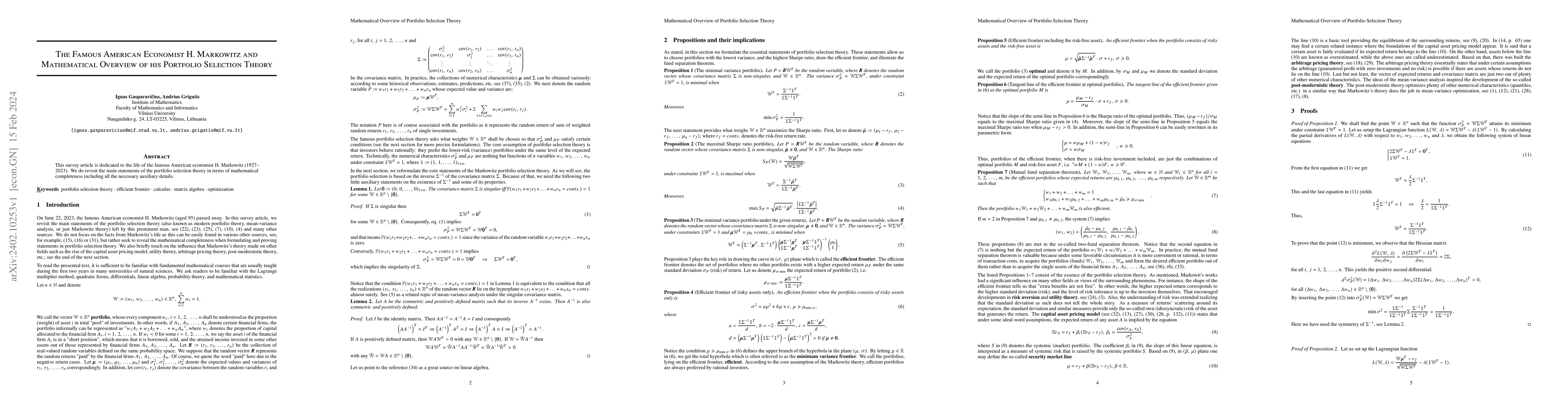 This survey article is dedicated to the life of the famous American economist H. Markowitz (1927--2023). We do revisit the main statements of the portfolio selection theory in terms of mathematical completeness including all the necessary auxiliary details.
