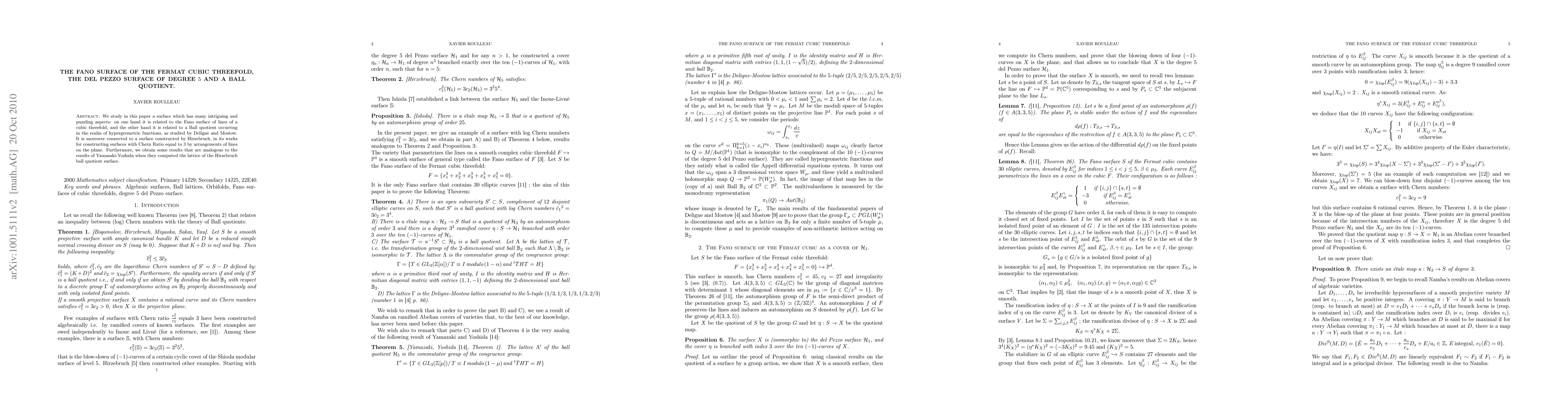Summary: This paper investigates the Fano surface S of the Fermat cubic threefold, proving it is a degree 81 abelian cover of the degree 5 del Pezzo surface, and shows that the complement of 12 elliptic curves on S forms a ball quotient linked to the Deligne-Mostow lattice number 1.